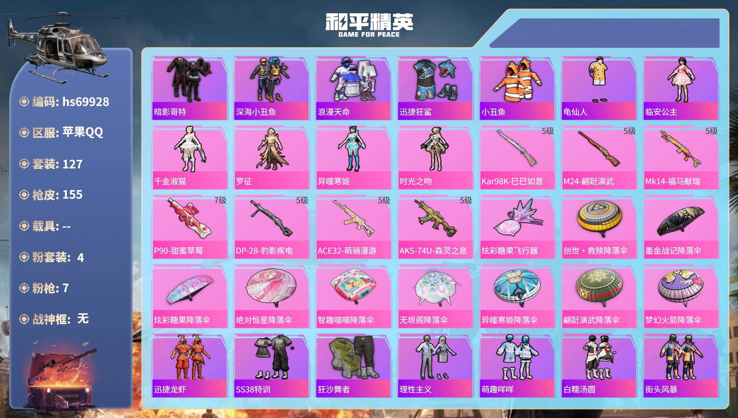 3粉装-5特效枪-1载具-1粉色飞行器-59349热力值-11王牌印记-165套装-203枪皮