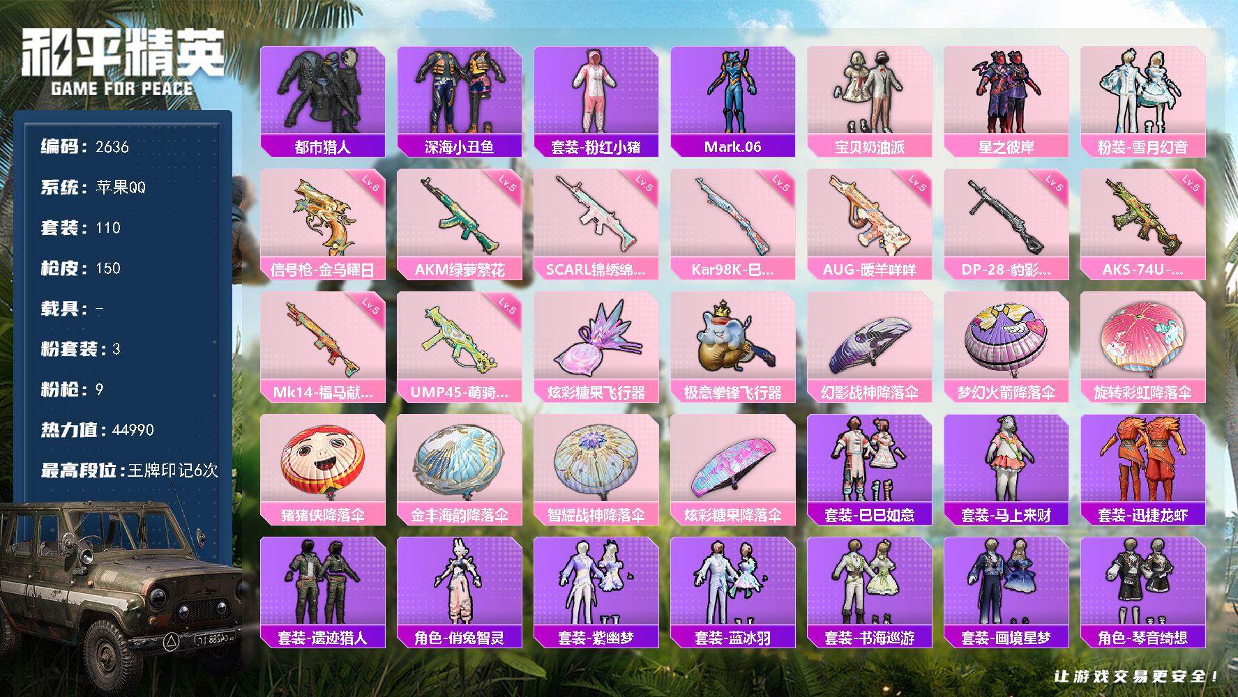 3粉装-4特效枪-0载具-0粉色飞行器-58906热力值-10王牌印记-151套装-201枪皮