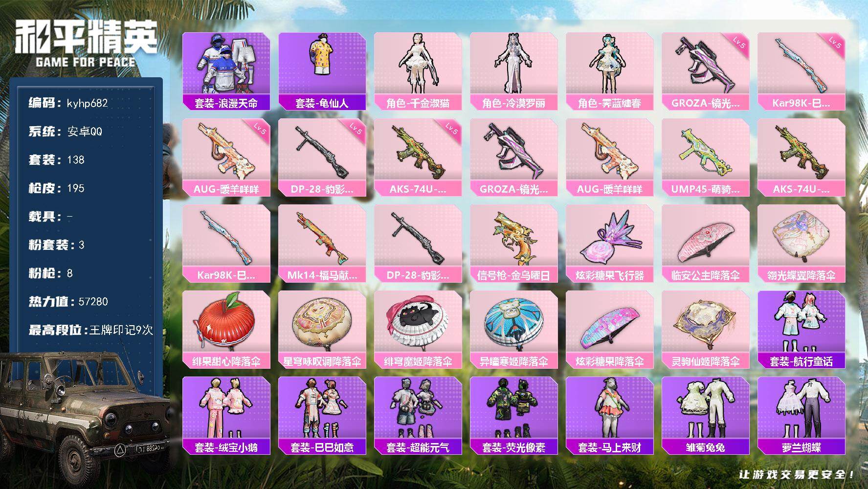 安卓 手Q-3粉装-8特效枪-0载具-1粉色飞行器-57280热力值-9王牌印记