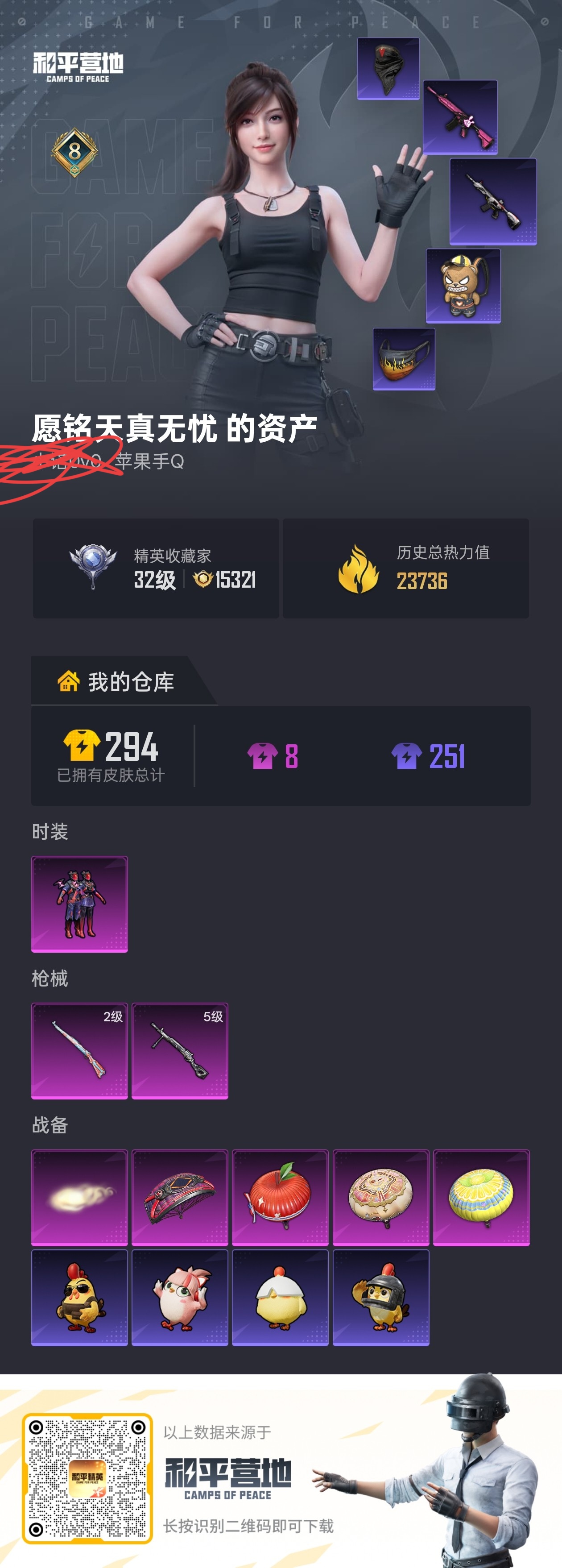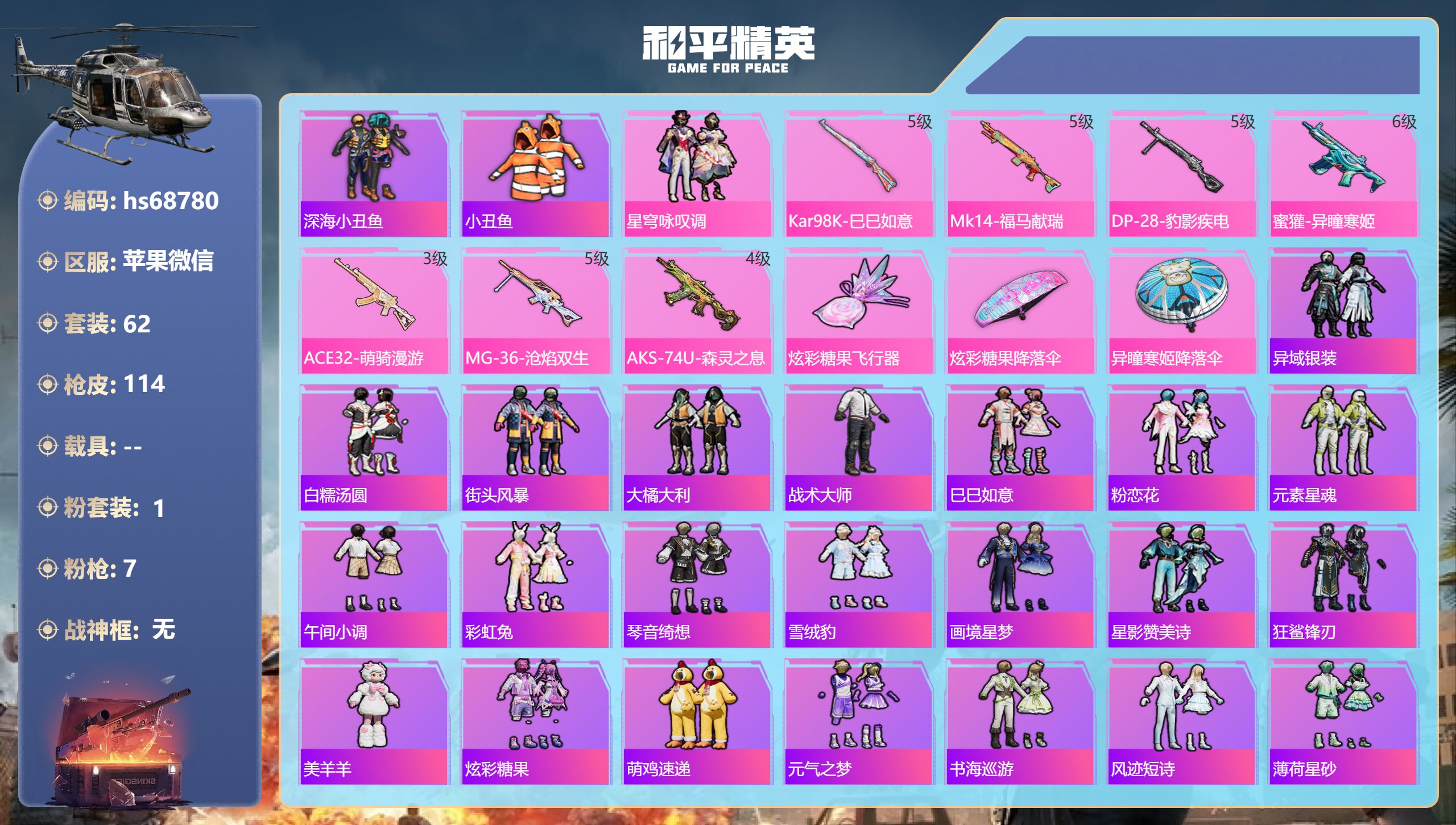 6王牌印记-1粉装-7特效枪-26873热力值-62套装-114枪皮-5卓越印记-3传奇印记