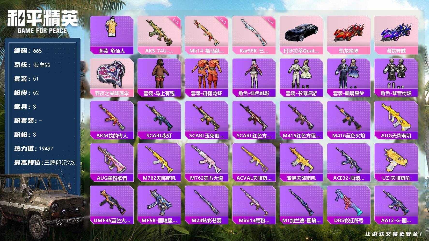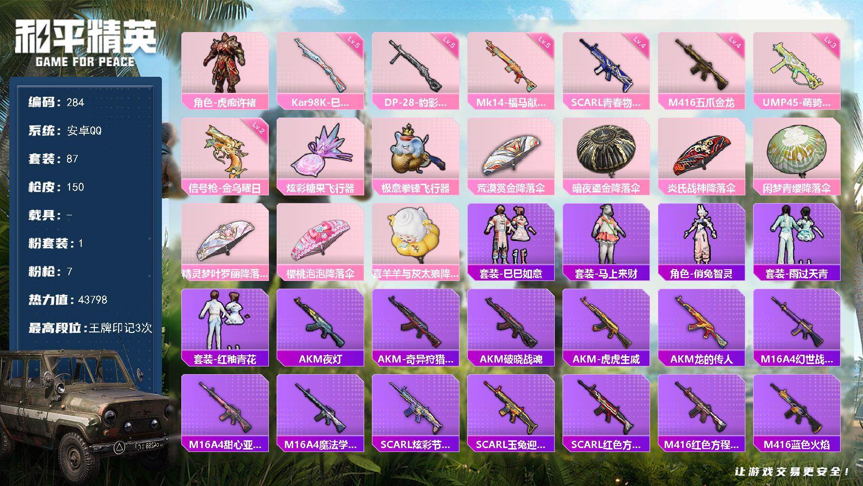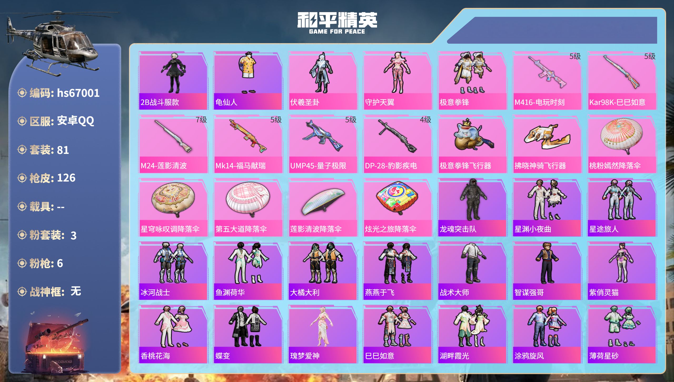 安卓手Q-0王牌印记-3粉装-6特效枪-36120热力值-81套