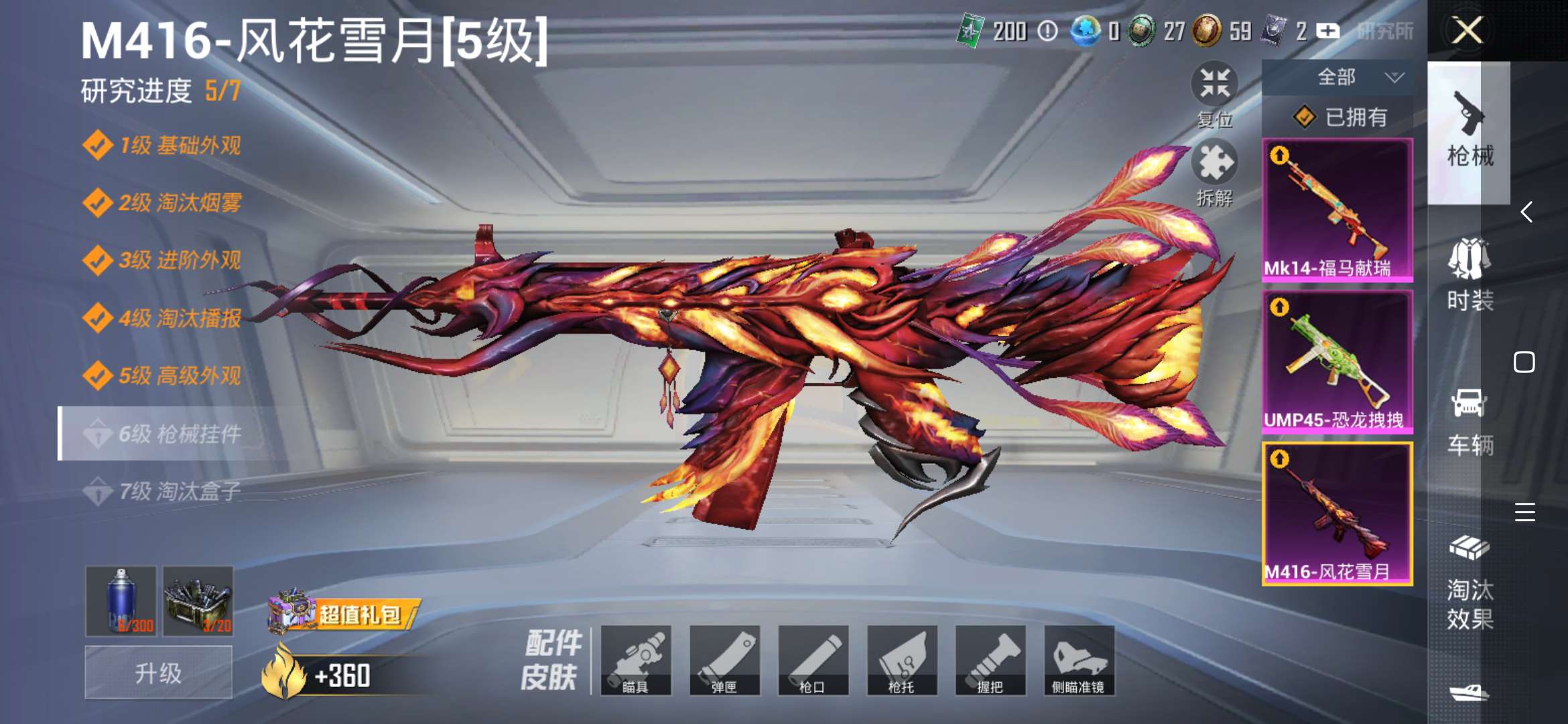 m416风花雪月、ump45恐龙拽拽、scar淘汰效果镭射皇者
