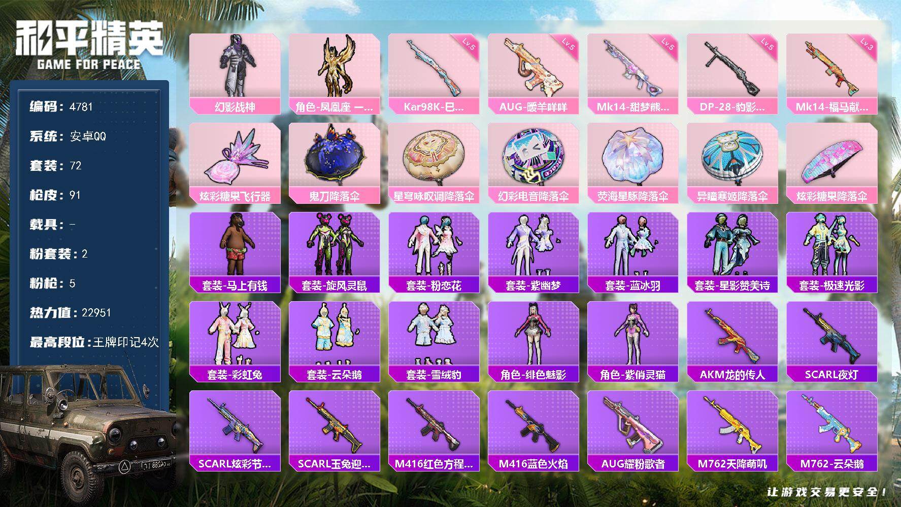 安卓手Q-4王牌印记-3粉装-6特效枪-63707热力值-167