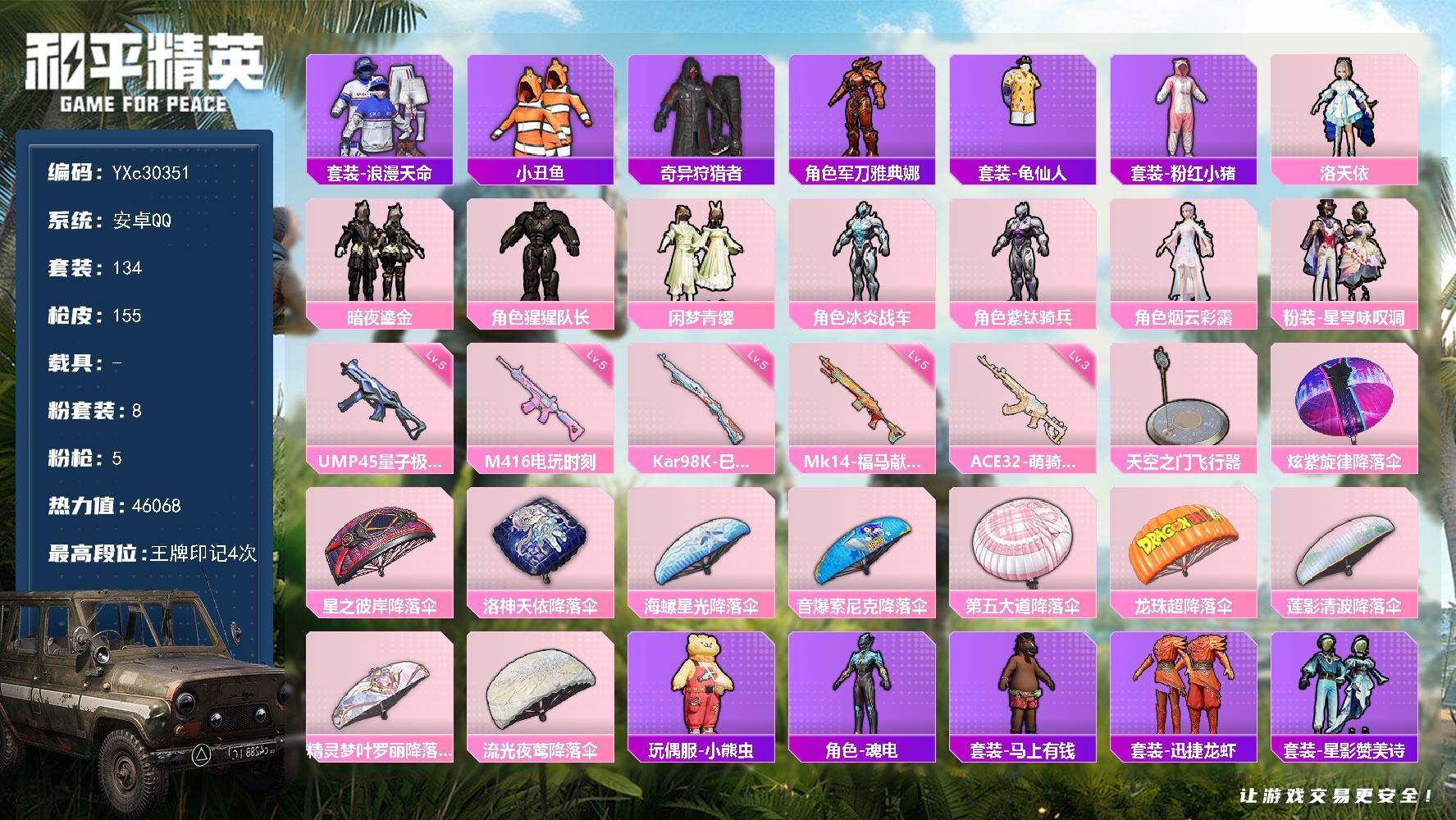 hs60409 安卓手Q-5王牌印记-3粉装-4特效枪-1载具-48760热力值-107套装-160