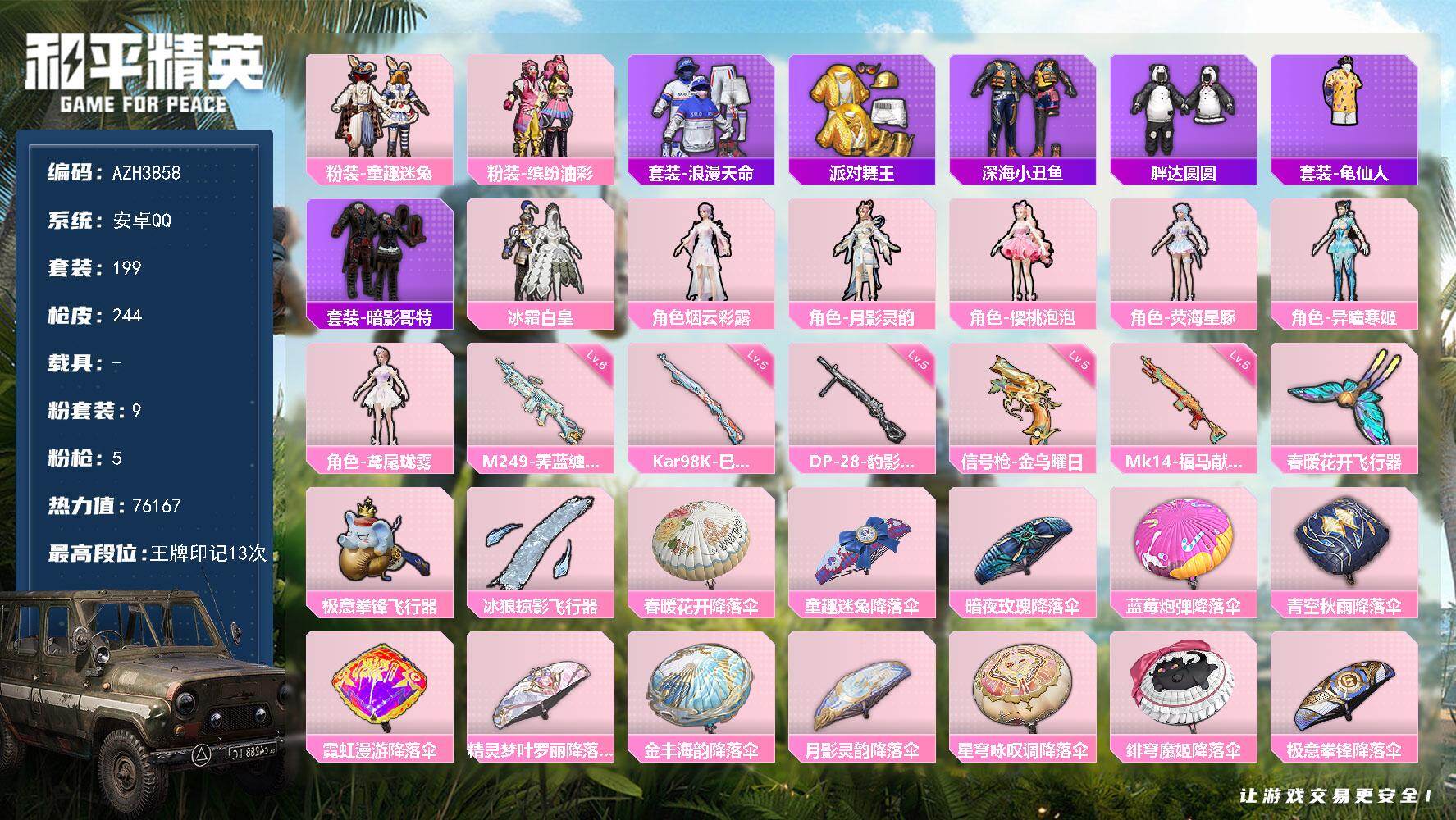 安卓 手Q-5粉装-4特效枪-0载具-4粉色飞行器-46824热力值-2王牌印