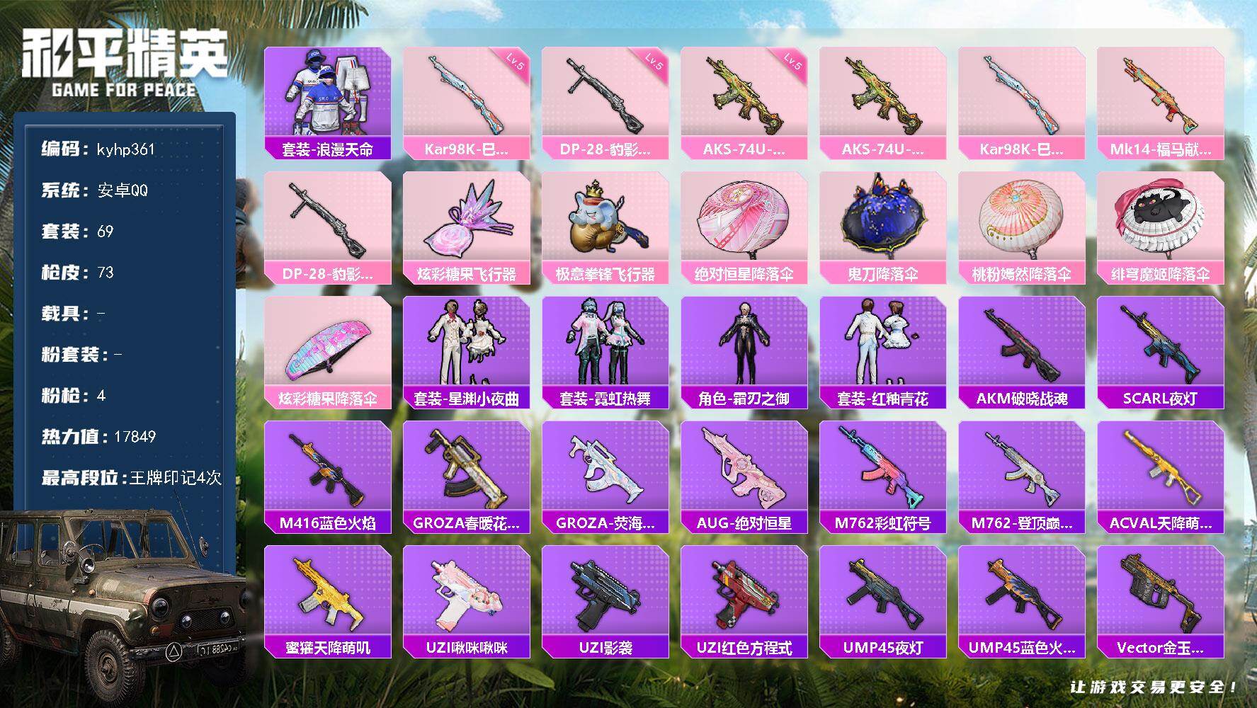 安卓 手Q-0粉装-4特效枪-0载具-2粉色飞行器-17849热力值-4王牌印