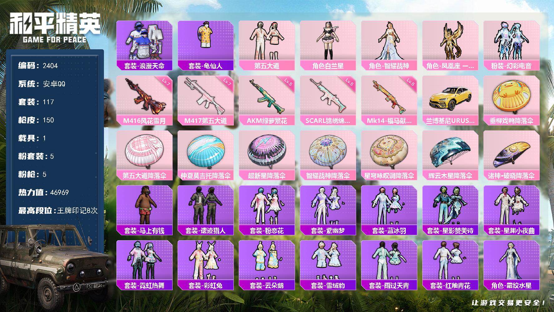 安卓微信-8王牌印记-3粉装-3特效枪-1载具-40099热力值