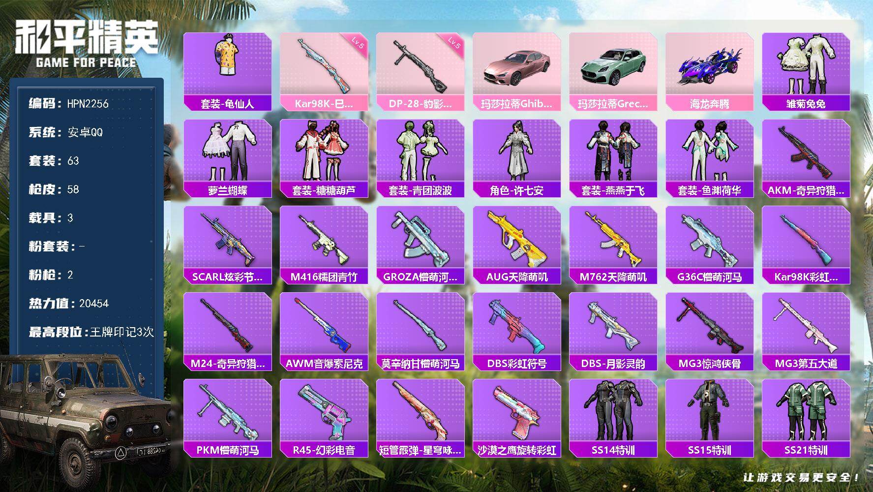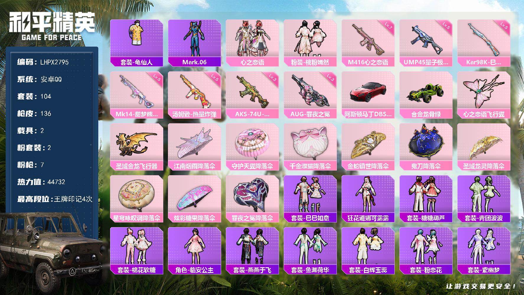 hs57870 安卓手Q-4王牌印记-4粉装-4特效枪-1载具-19900热力值-34套装-55枪皮