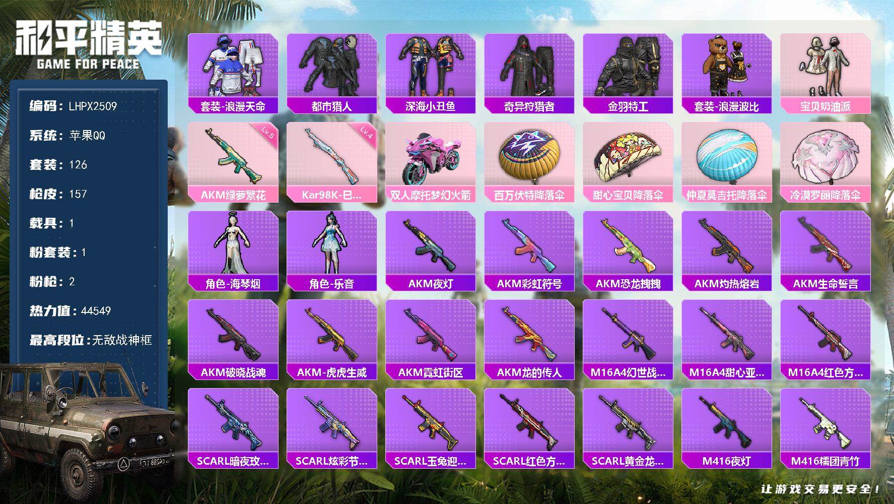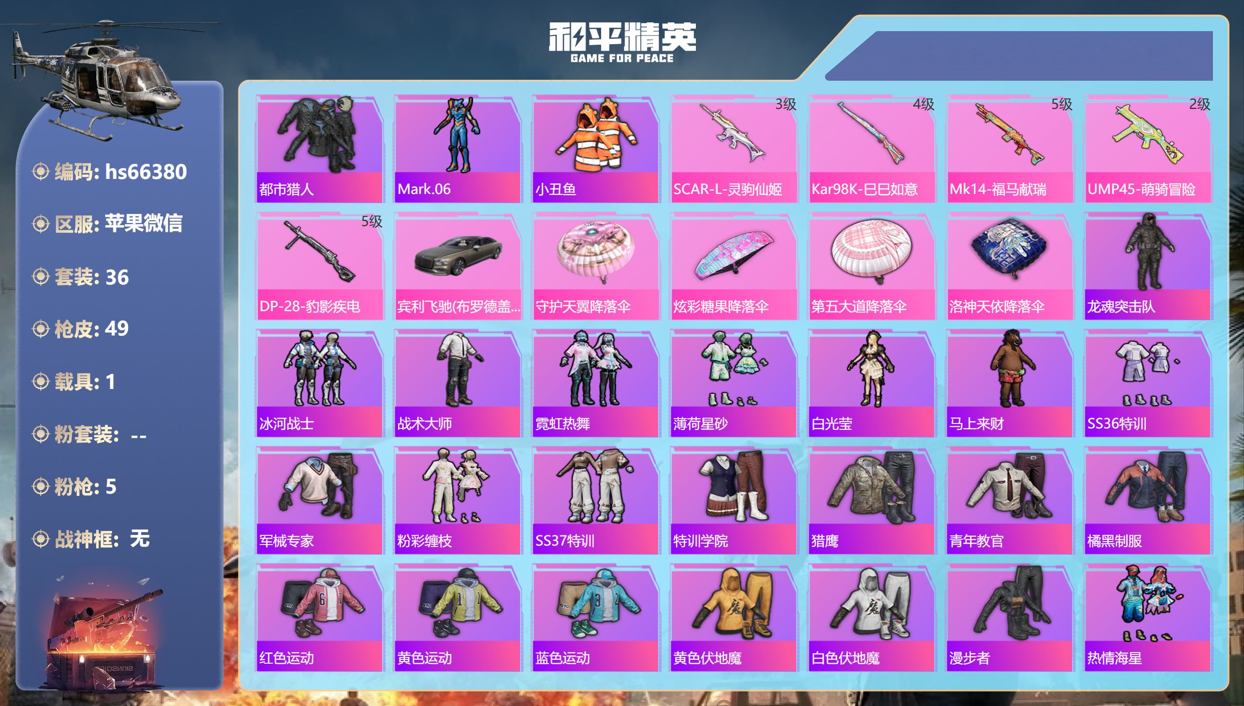 苹果 微信-4粉装-5特效枪-0载具-0粉色飞行器-60052热力值-20王牌
