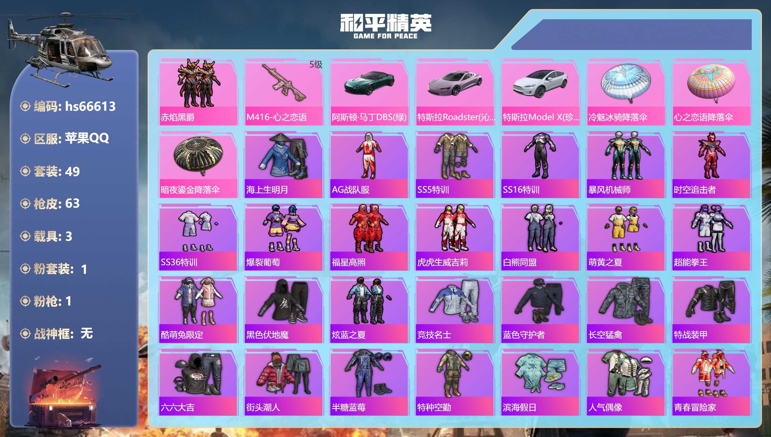 hs66613 苹果手Q-2王牌印记-1粉装-1特效枪-3载具-23618热力值-49套装-63枪皮