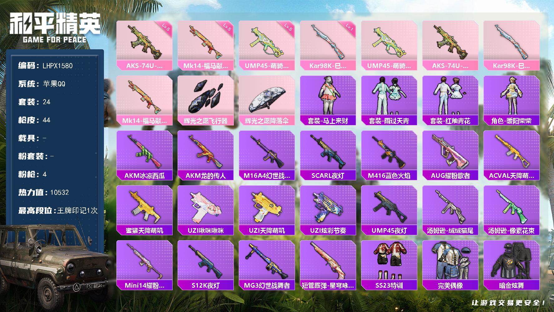 0粉装-4特效枪-0载具-1粉色飞行器-10532热力值-1王牌印记-24套装-44枪皮