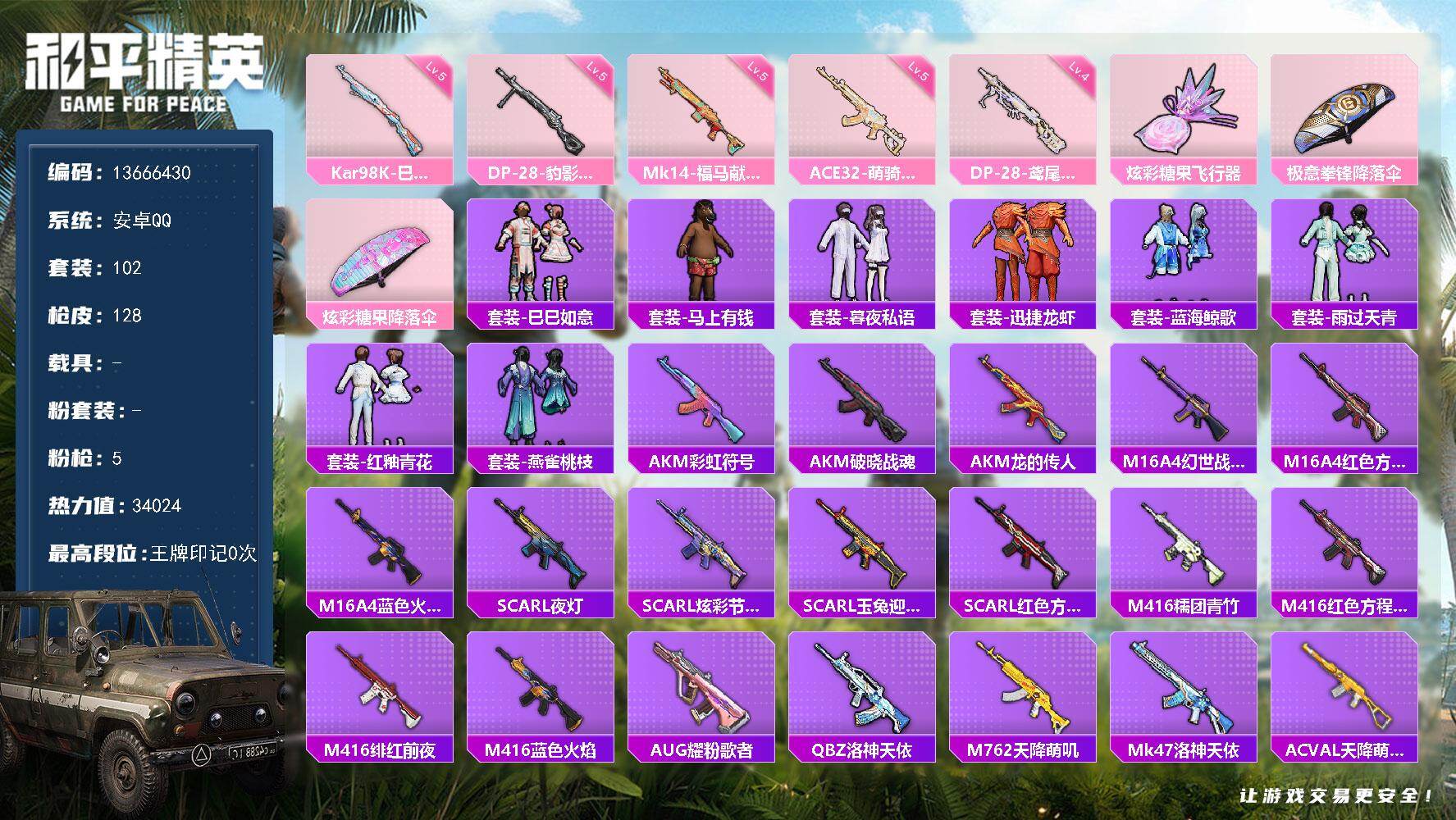安卓 手Q-0粉装-1特效枪-0载具-0粉色飞行器-5450热力值-2王牌印记