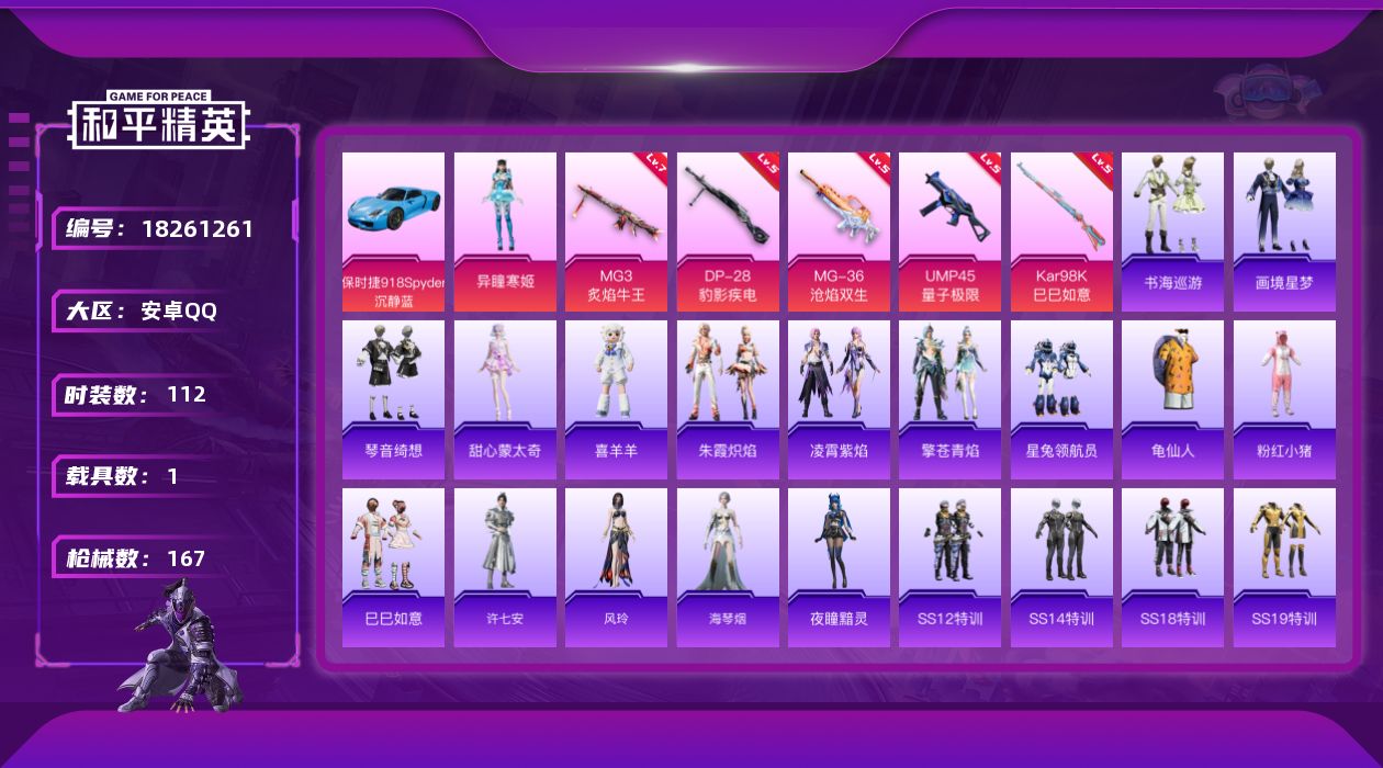 11王牌印记-5粉装-10特效枪-63023热力值-155套装-224枪皮-1卓越印记-1传奇印记
