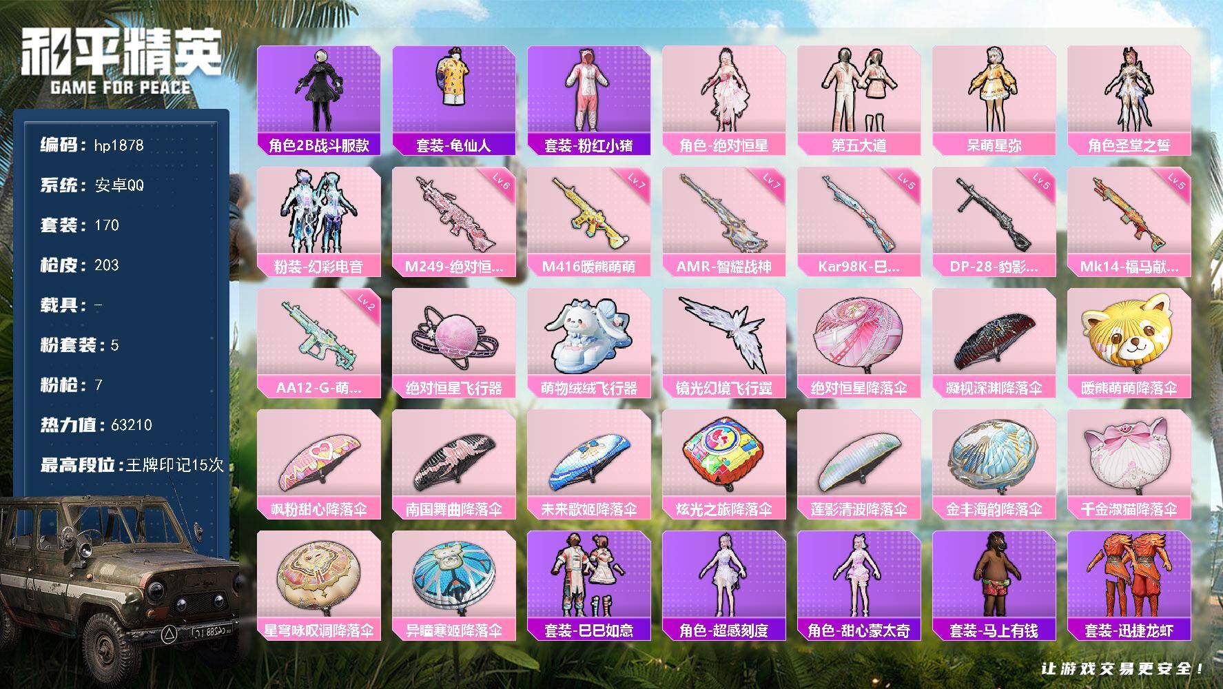 安卓 手Q-5粉装-7特效枪-0载具-3粉色飞行器-63210热力值-15王牌