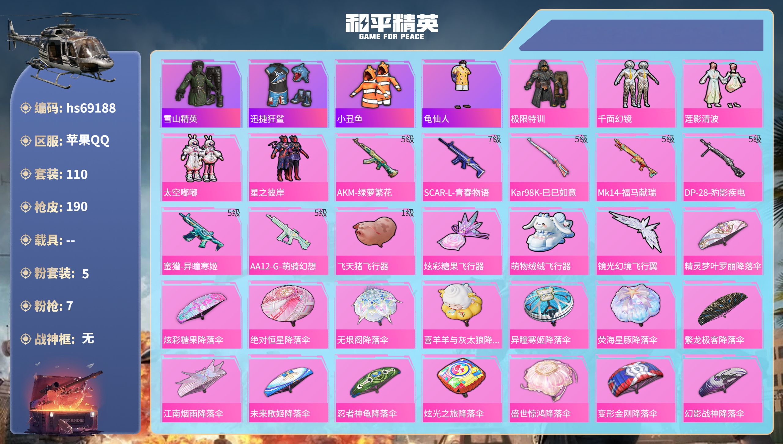 苹果 微信-4粉装-4特效枪-0载具-4粉色飞行器-50772热力值-10王牌