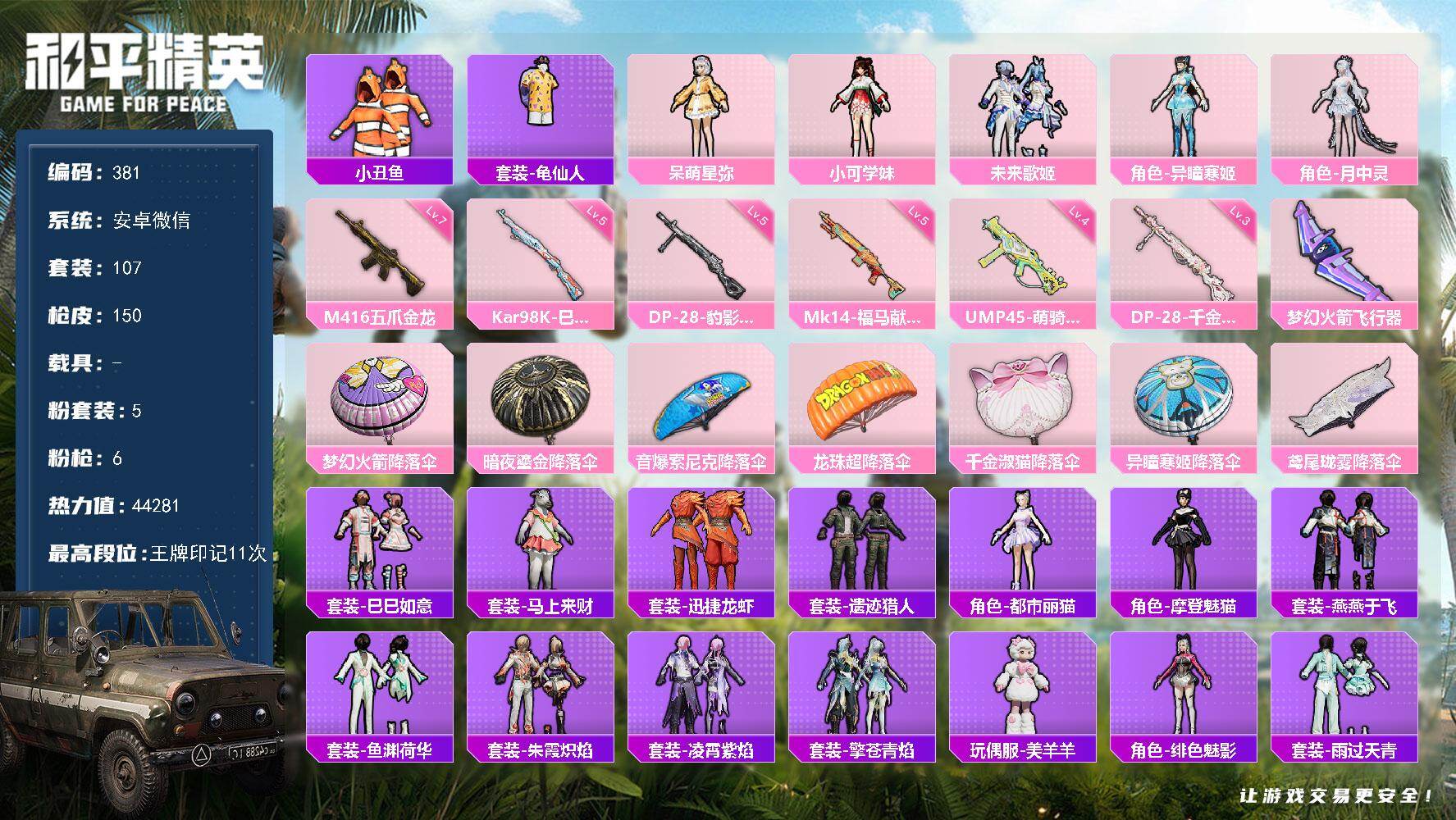 安卓 手Q-4粉装-6特效枪-0载具-1粉色飞行器-39280热力值-6王牌印