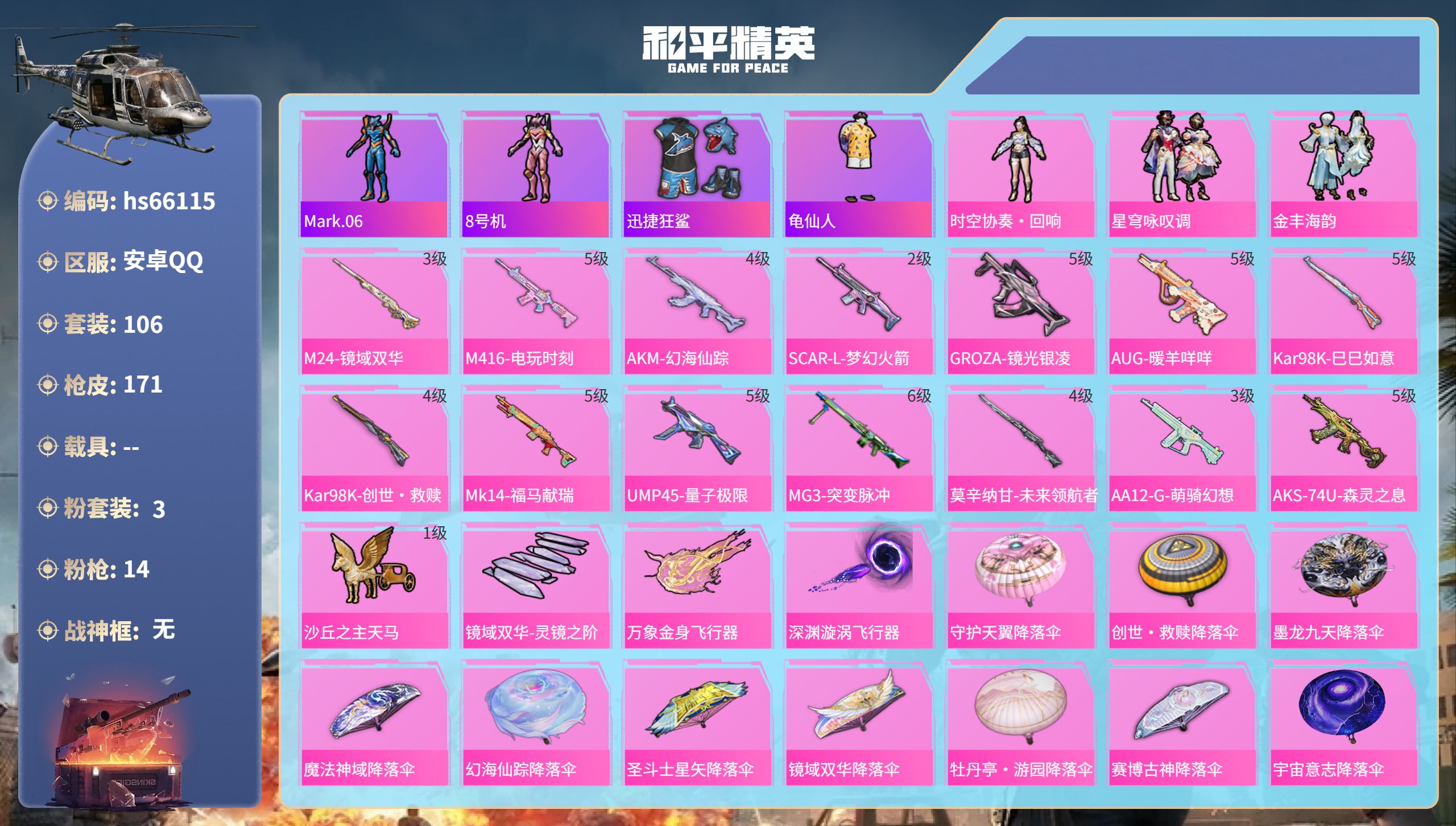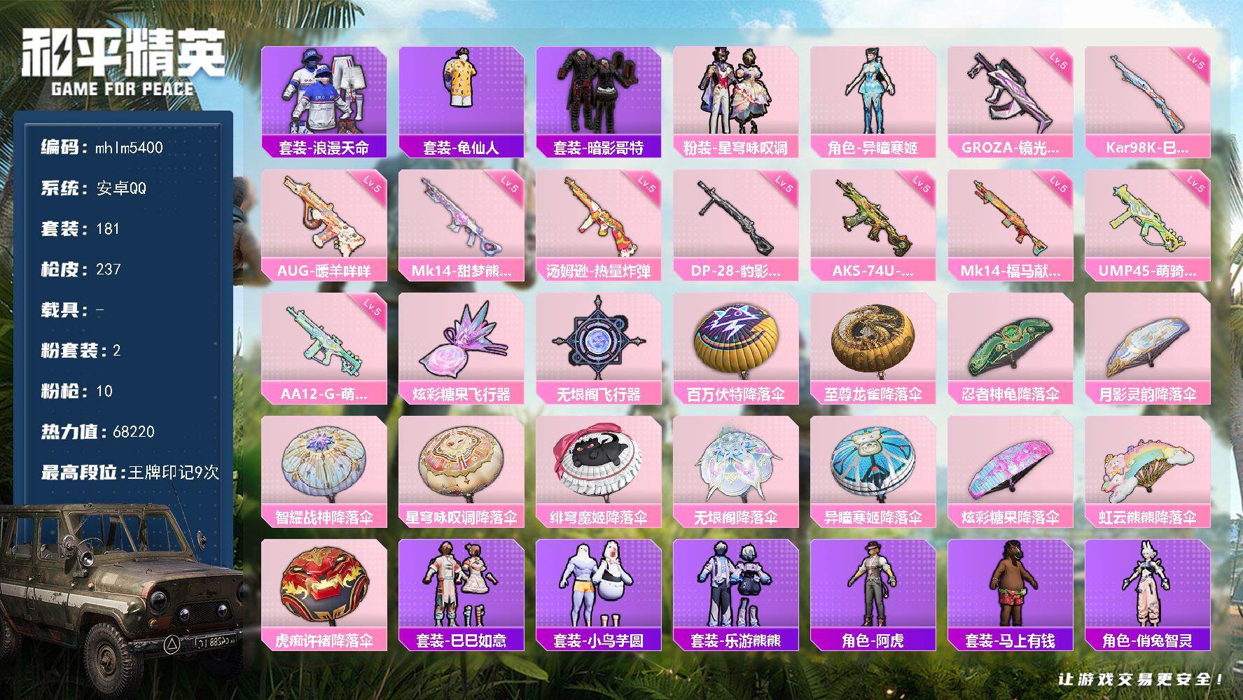 安卓 手Q-2粉装-10特效枪-0载具-2粉色飞行器-68220热力值-9王牌印
