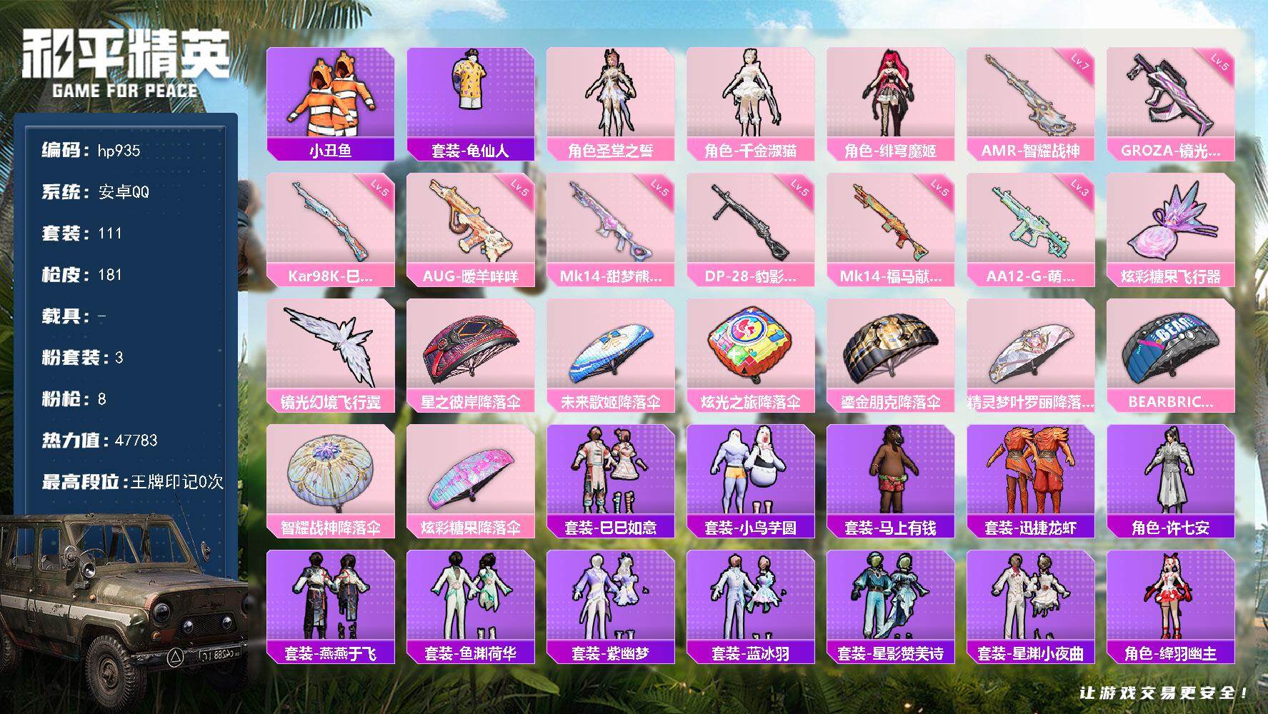 安卓 手Q-3粉装-7特效枪-0载具-2粉色飞行器-38644热力值-6王牌印记