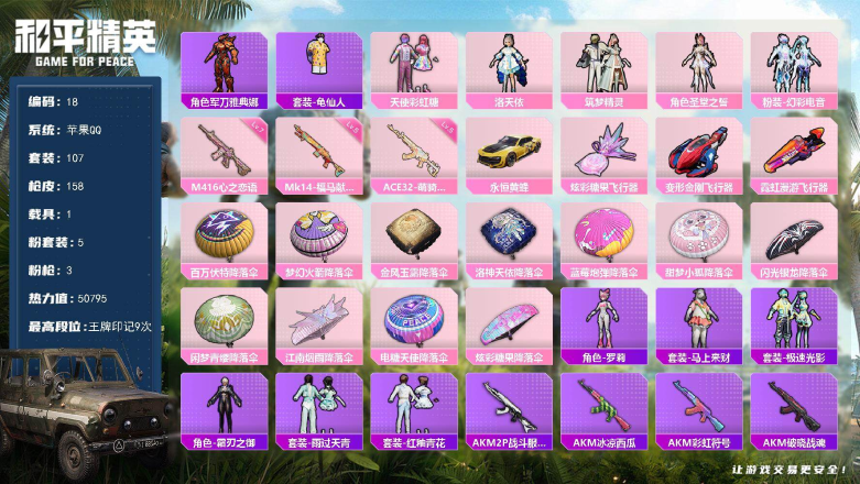 苹果 手Q-3粉装-7特效枪-1载具-1粉色飞行器-40520热力值-5王牌印记