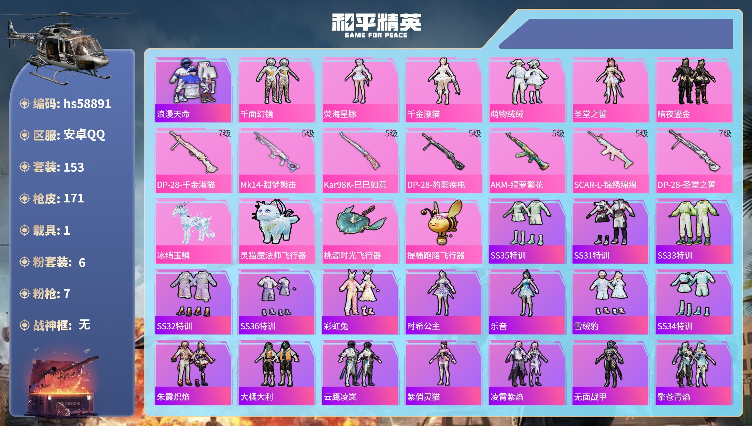 hs58891 安卓手Q-9王牌印记-6粉装-7特效枪-1载具-55975热力值-153套装-171
