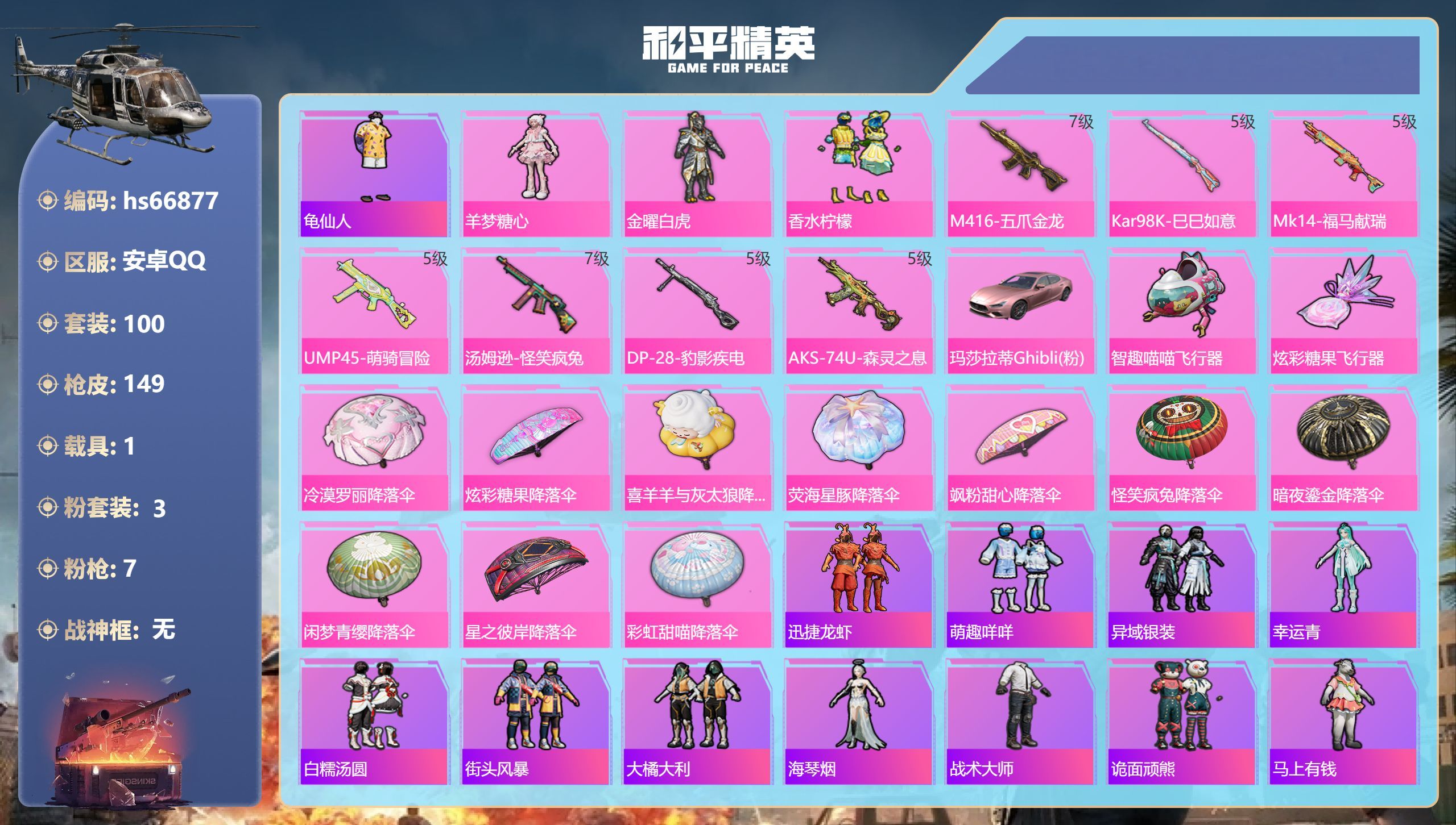 hs66877 安卓手Q-7王牌印记-3粉装-7特效枪-1载具-44204热力值-100套装-149