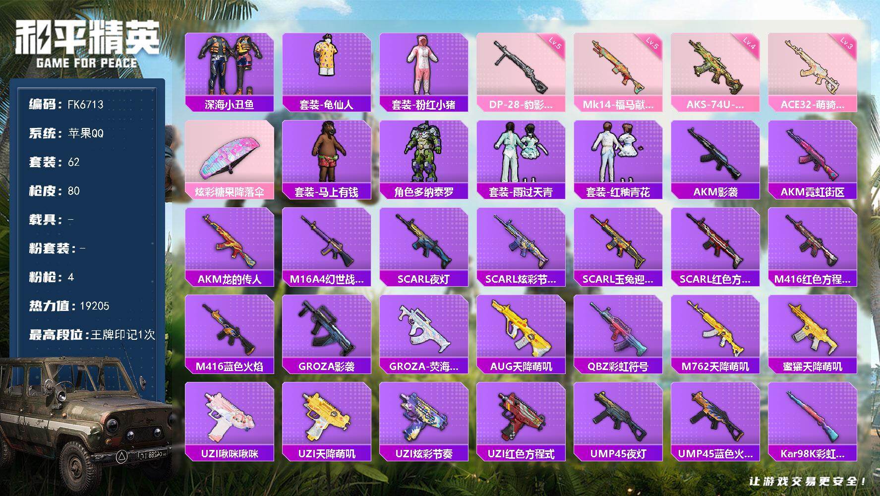【FK6713】62套装/枪械4/装备61/战备45/王牌印记1/热力值192