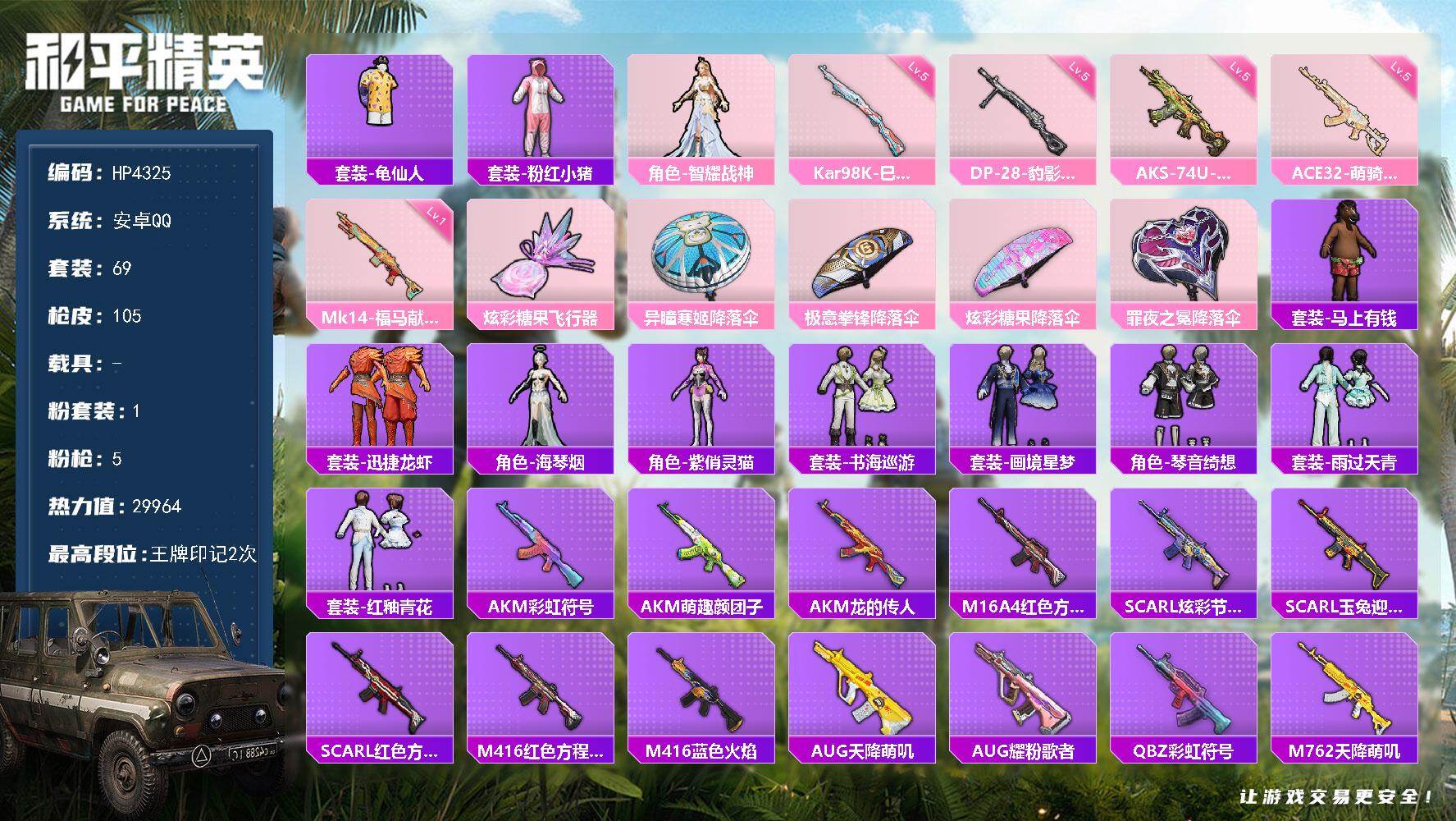 安卓 手Q-1粉装-5特效枪-0载具-1粉色飞行器-29964热力值-2王牌印