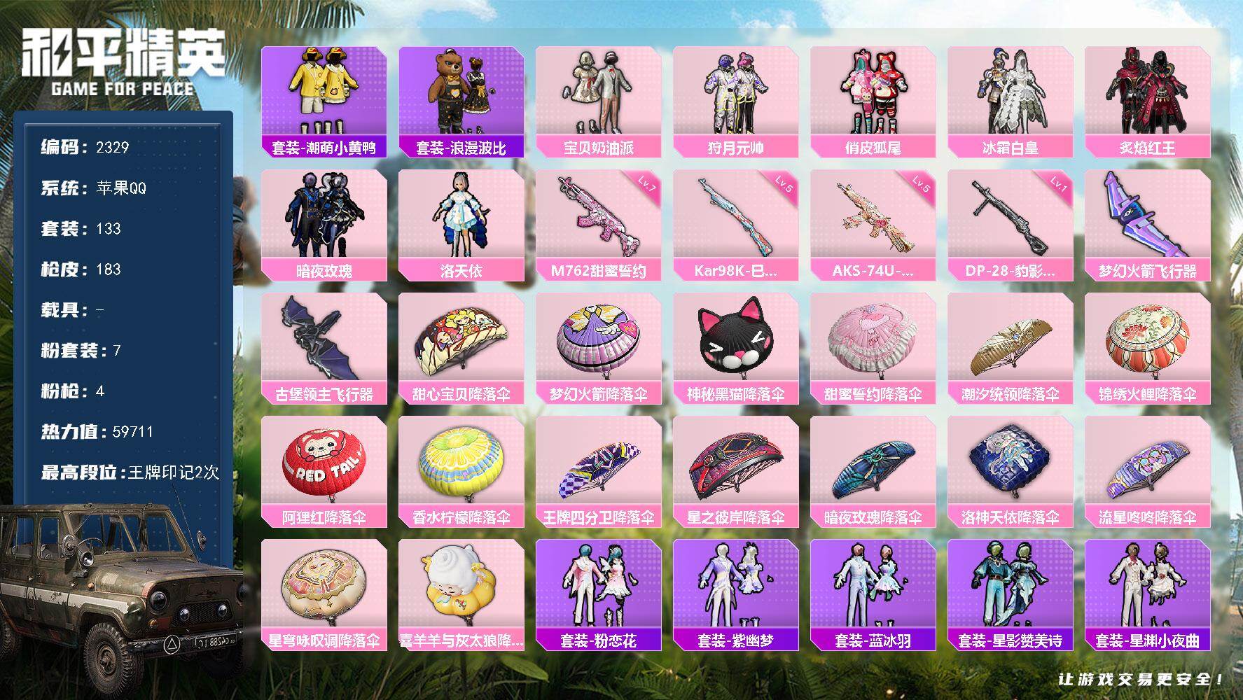 苹果 手Q-4粉装-4特效枪-1载具-1粉色飞行器-37398热力值-2王牌印