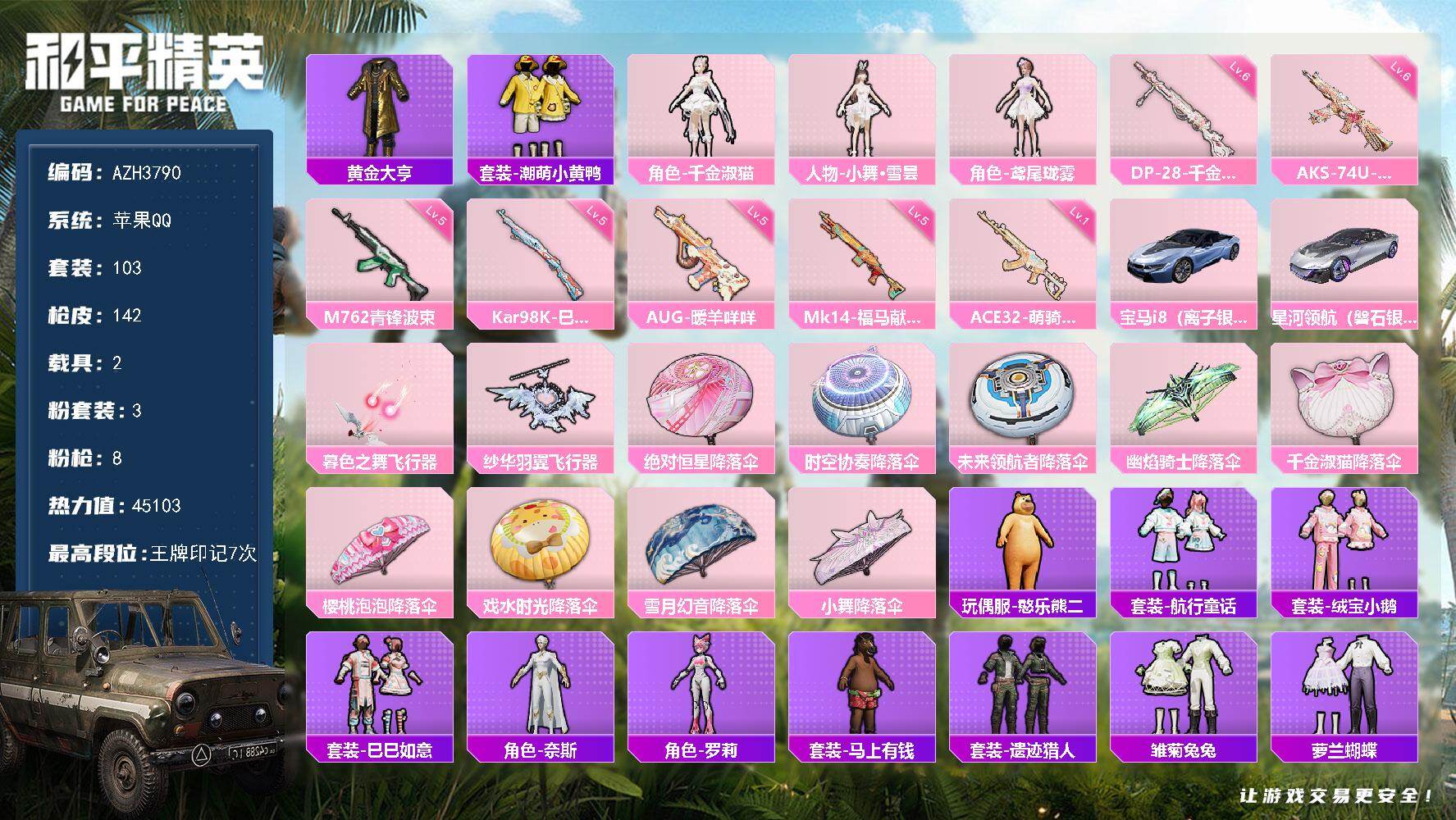 苹果 手Q-3粉装-10特效枪-1载具-1粉色飞行器-38104热力值-5王牌