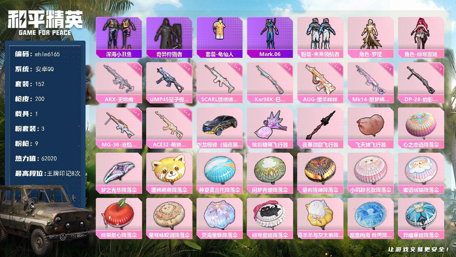 安卓 手Q-4粉装-5特效枪-0载具-1粉色飞行器-58813热力值-11王牌