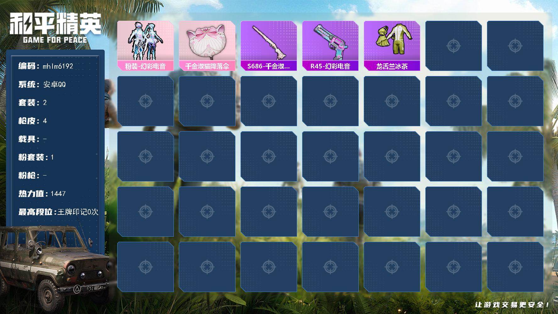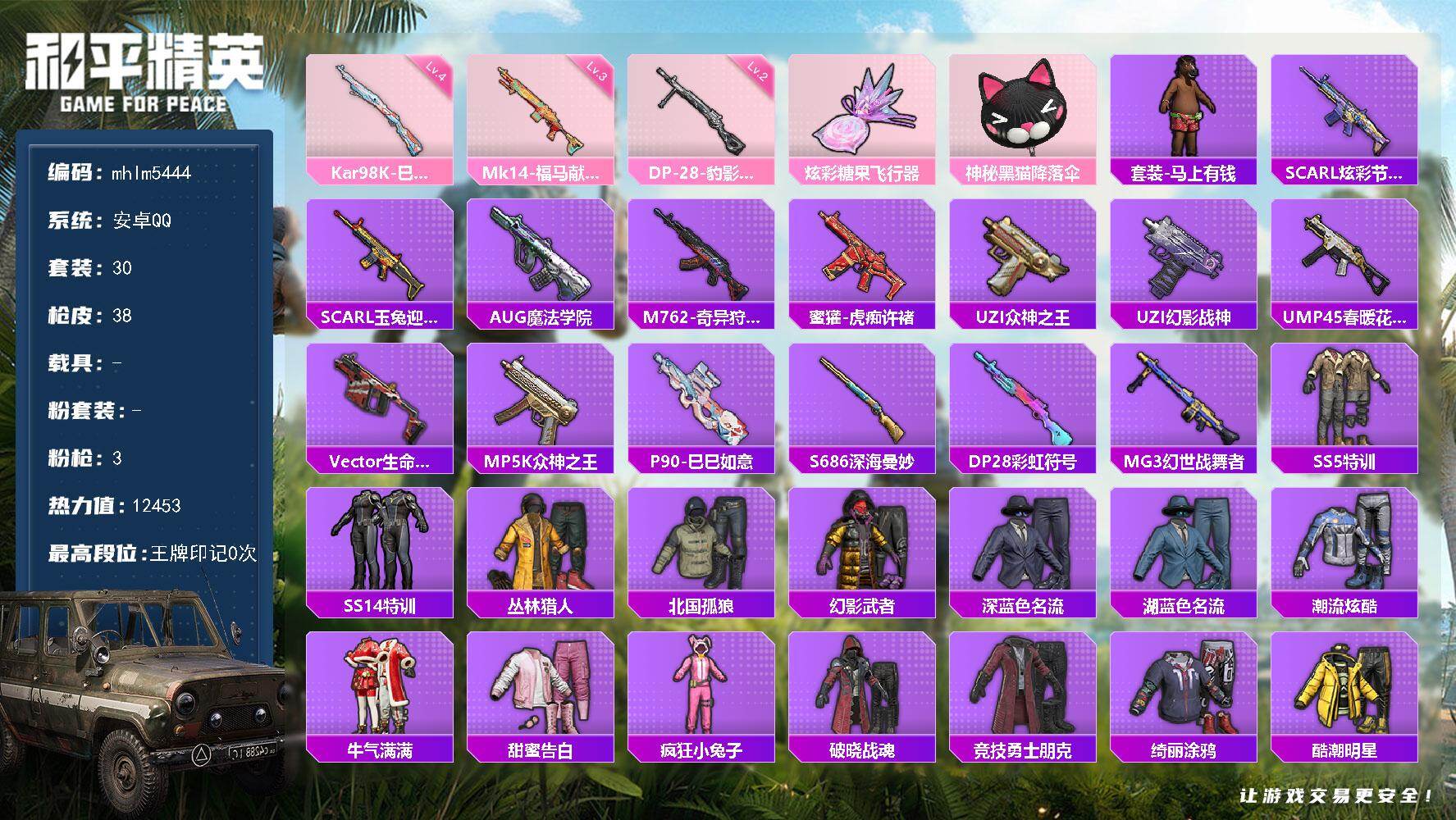安卓 手Q-0粉装-4特效枪-0载具-1粉色飞行器-19843热力值-3王牌印