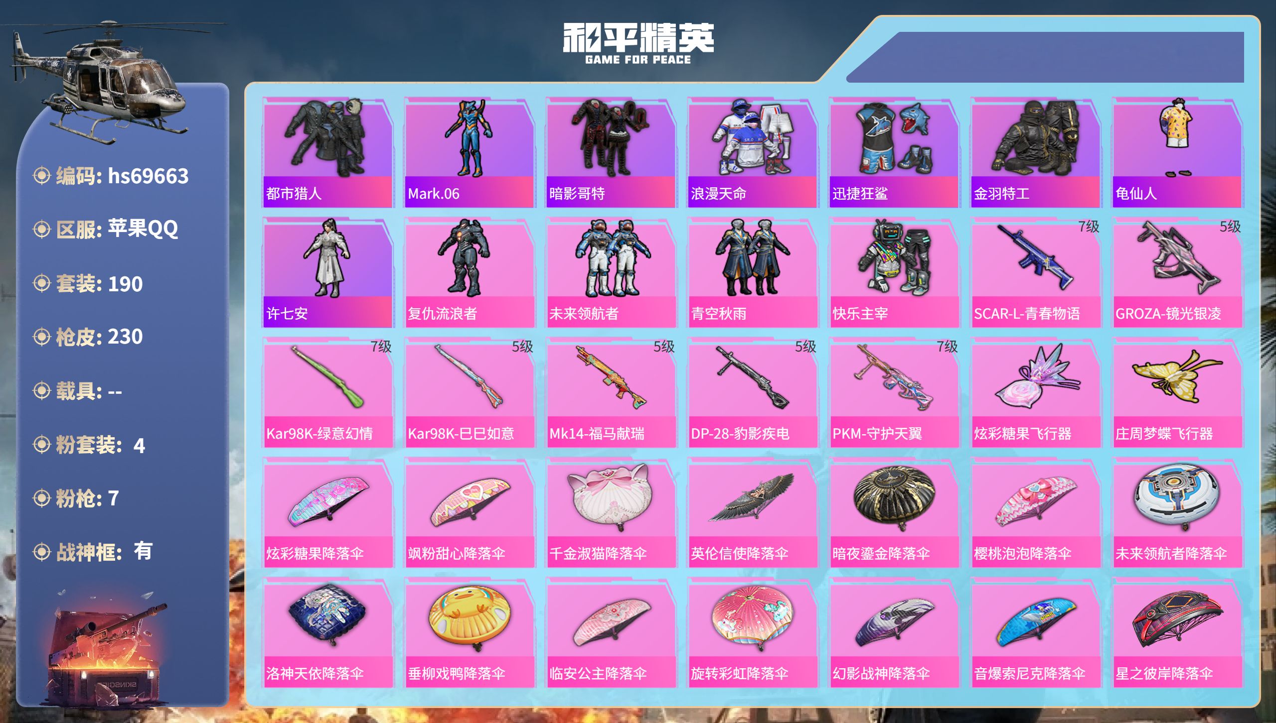 5粉装-3特效枪-1载具-1粉色飞行器-53751热力值-13王牌印记-138套装-176枪皮
