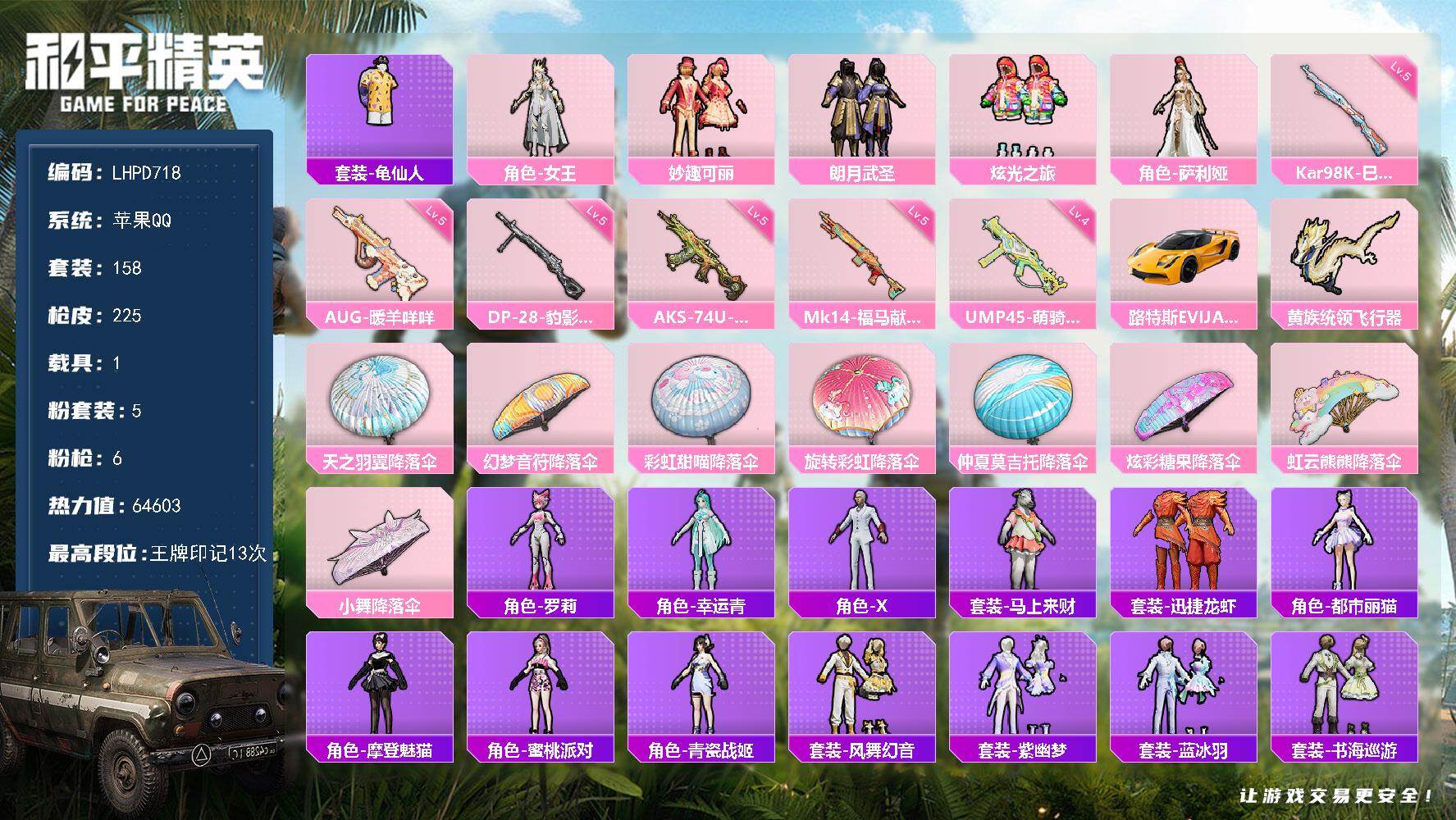 5粉装-6特效枪-1载具-1粉色飞行器-64603热力值-13王牌印记-158套装-225枪皮