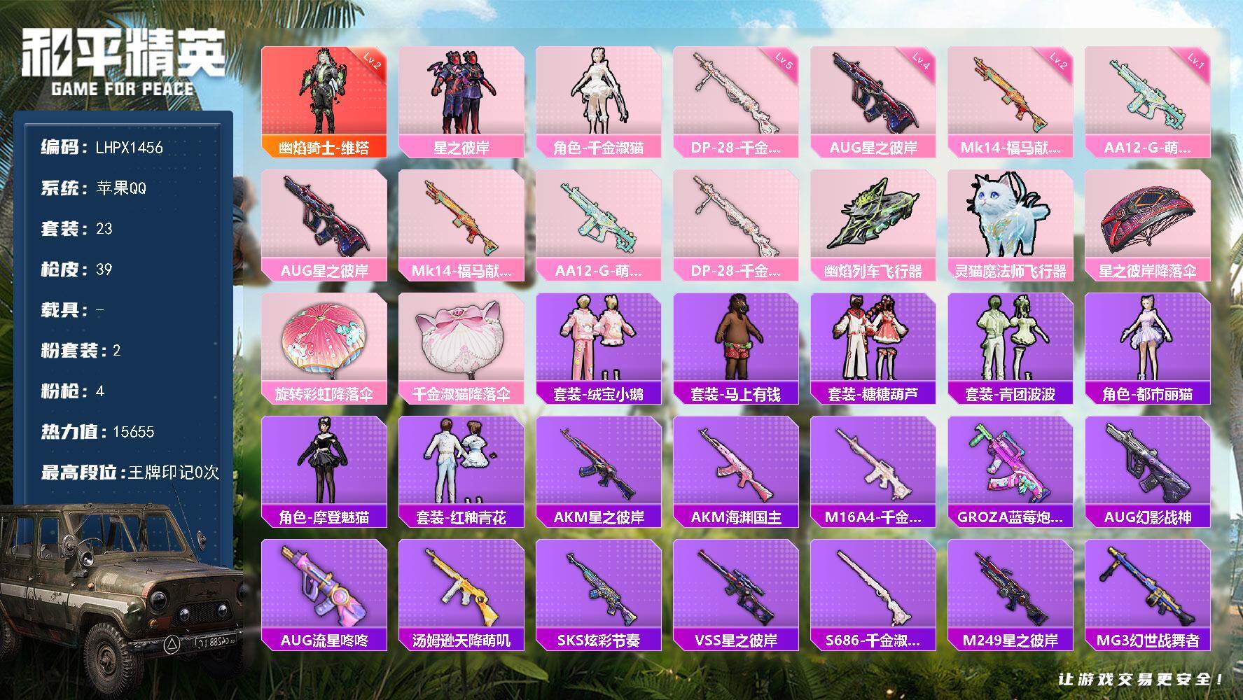 1神装-2粉装-4特效枪-2粉色飞行器-15655热力值-2王牌印记-23套装-39枪皮