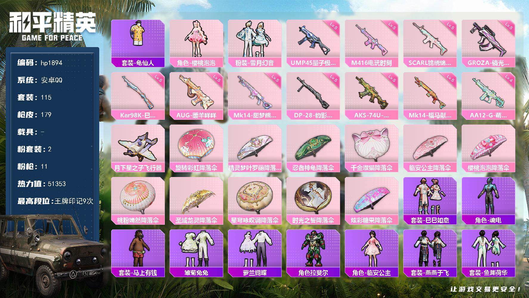 安卓 手Q-2粉装-11特效枪-0载具-1粉色飞行器-51353热力值-9王牌