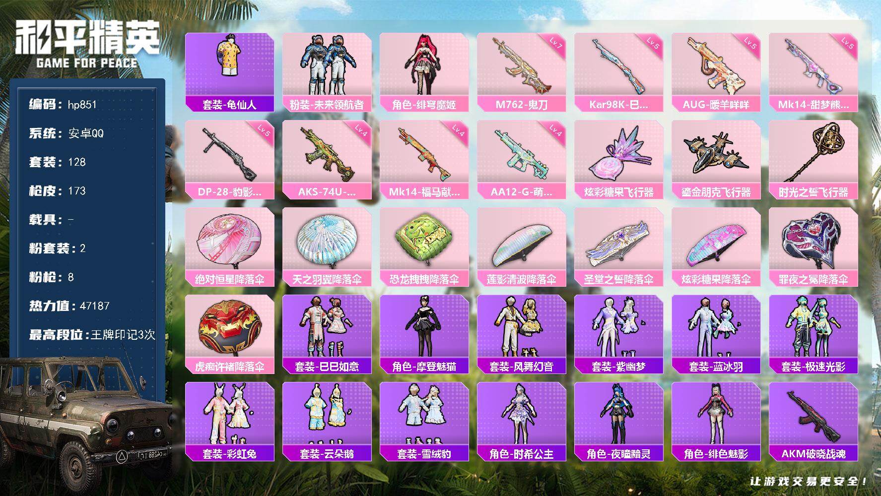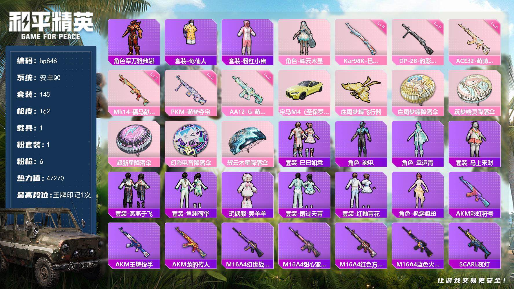 安卓 手Q-1粉装-6特效枪-1载具-1粉色飞行器-47270热力值-1王牌印