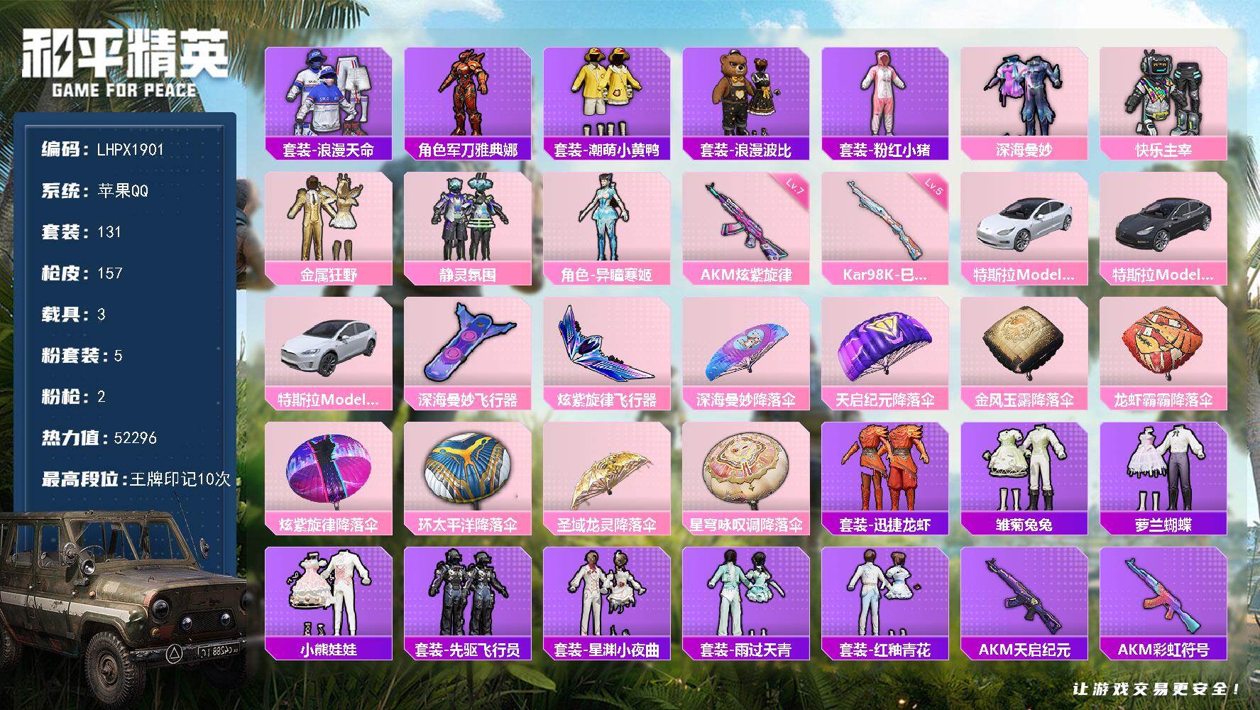 5粉装-2特效枪-3载具-2粉色飞行器-52296热力值-10王牌印记-131套装-157枪皮