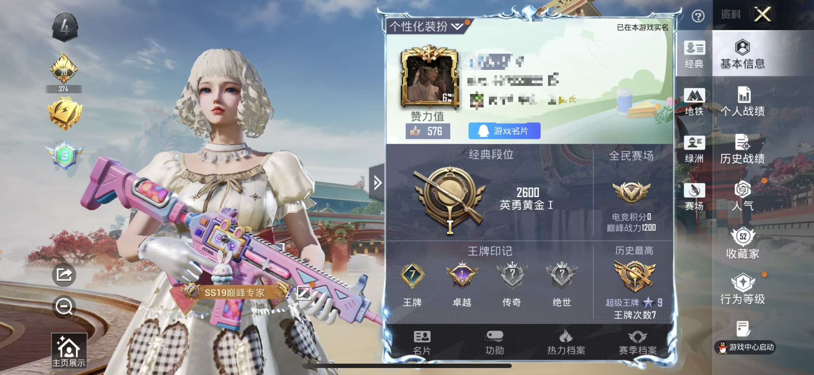 粉装6/粉枪5/珍稀飞行器100681/套装53/枪皮71/热力值22099/历史最高段位:王牌印记4次/Lv:43/