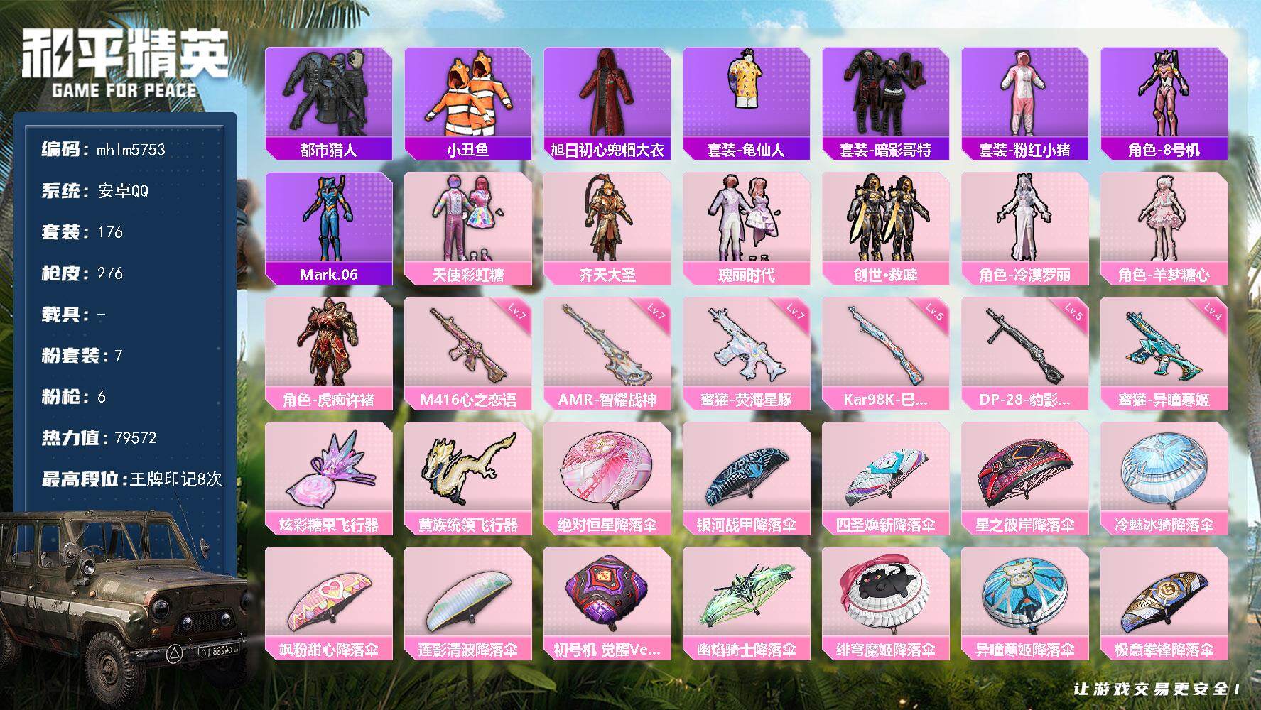 7粉装-6特效枪-0载具-2粉色飞行器-79572热力值-8王牌印记-176套装-276枪皮