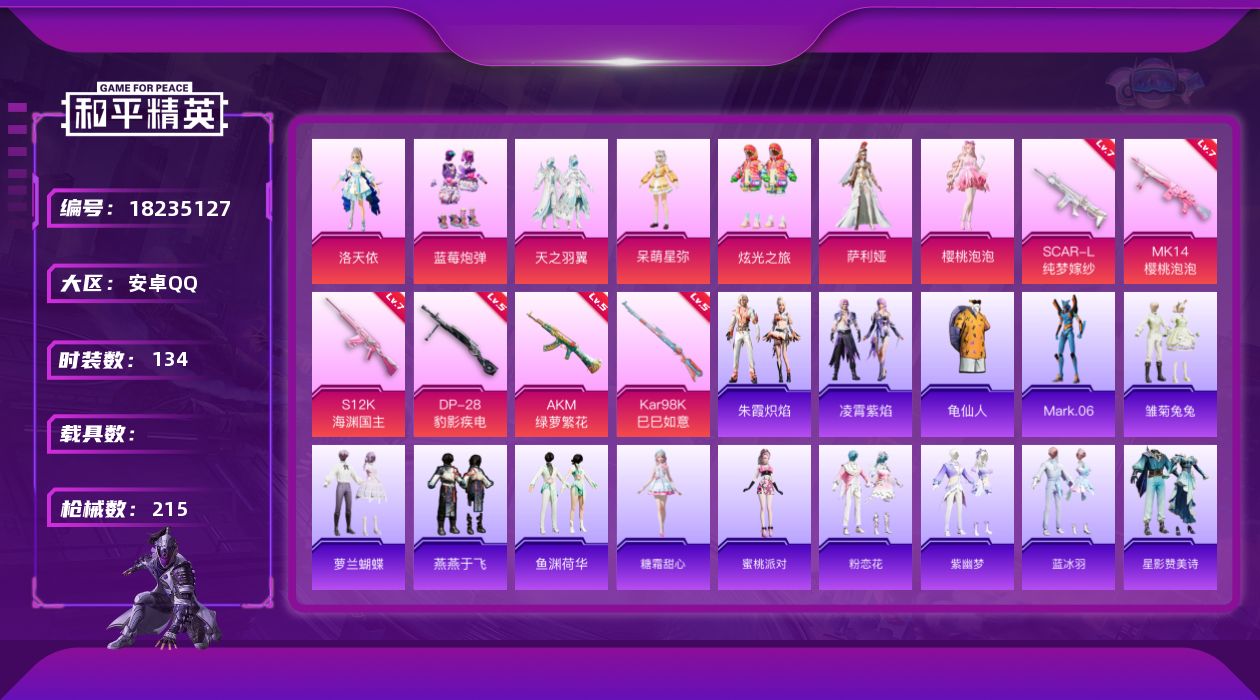 (8粉套4粉枪1载具)紫电风暴/傲雪凌霜/垂柳戏鸭/霞光圣骑/小可学妹/金丰海韵