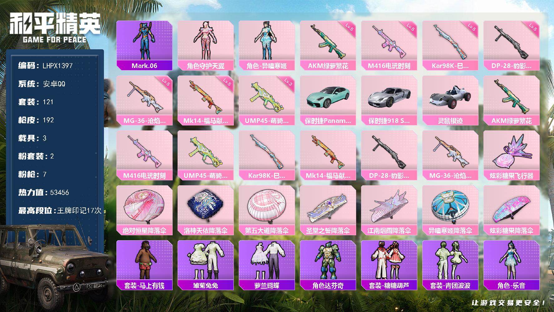 安卓 手Q-5粉装-5特效枪-3载具-4粉色飞行器-66652热力值-4王牌印
