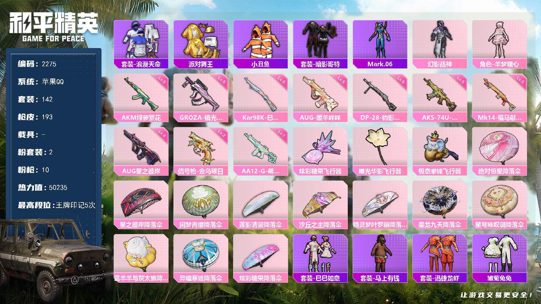2粉装-10特效枪-0载具-3粉色飞行器-50235热力值-5王牌印记-142套装-193枪皮