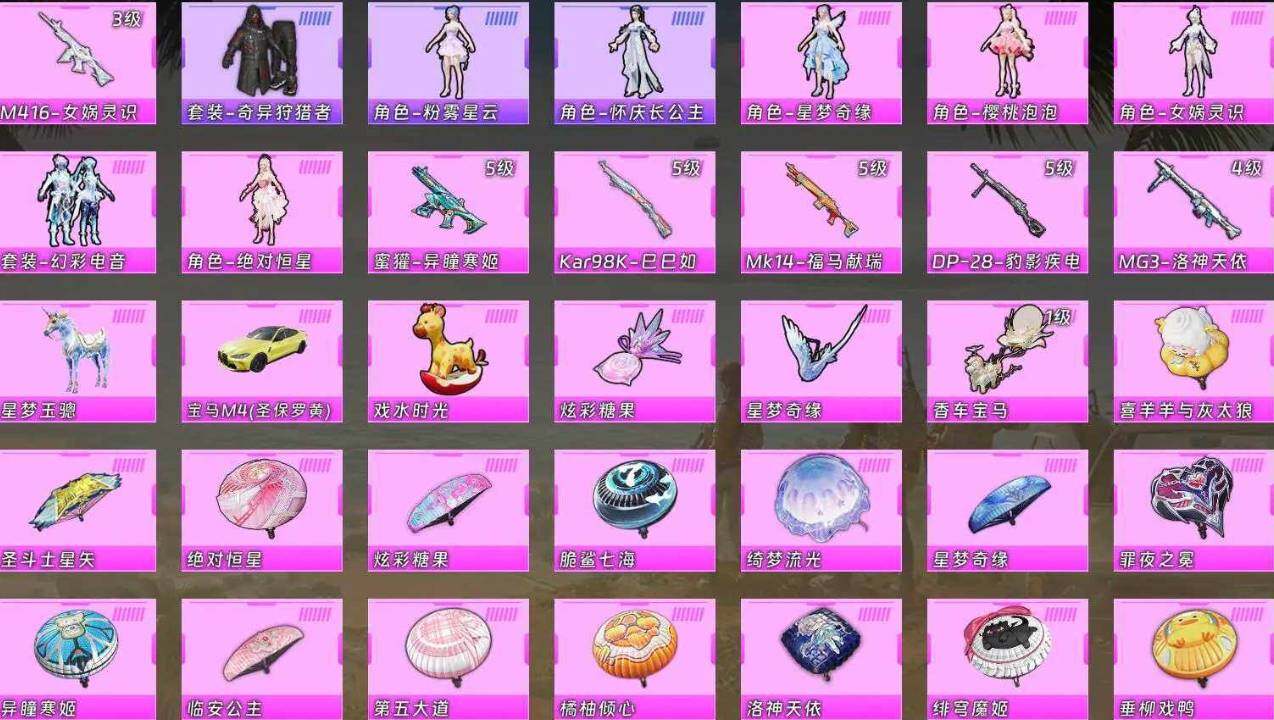 5粉装-12特效枪-1载具-1粉色飞行器-58640热力值-3王牌印记-117套装-181枪皮