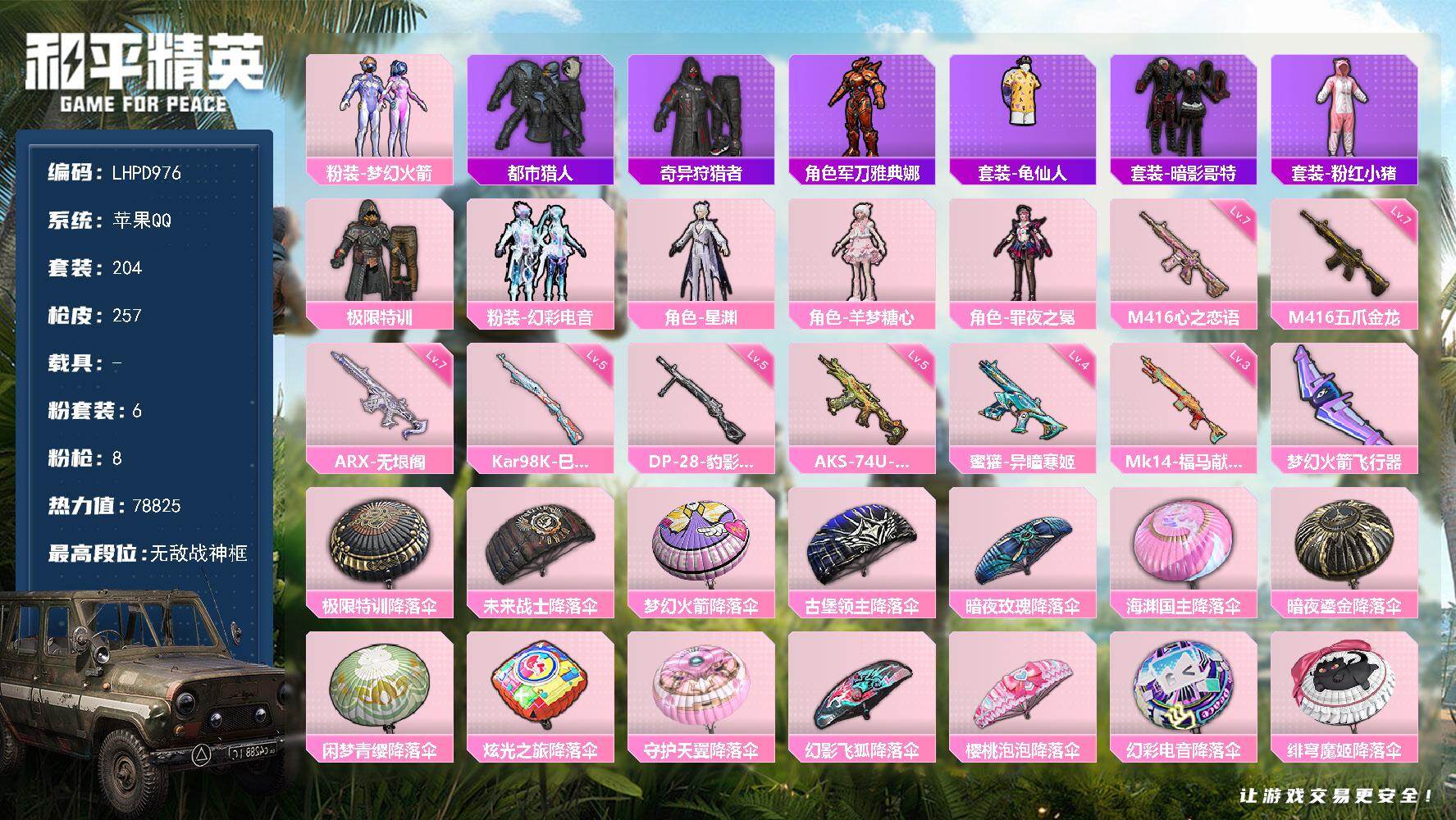安卓 手Q-3粉装-7特效枪-1载具-1粉色飞行器-38046热力值-14王牌