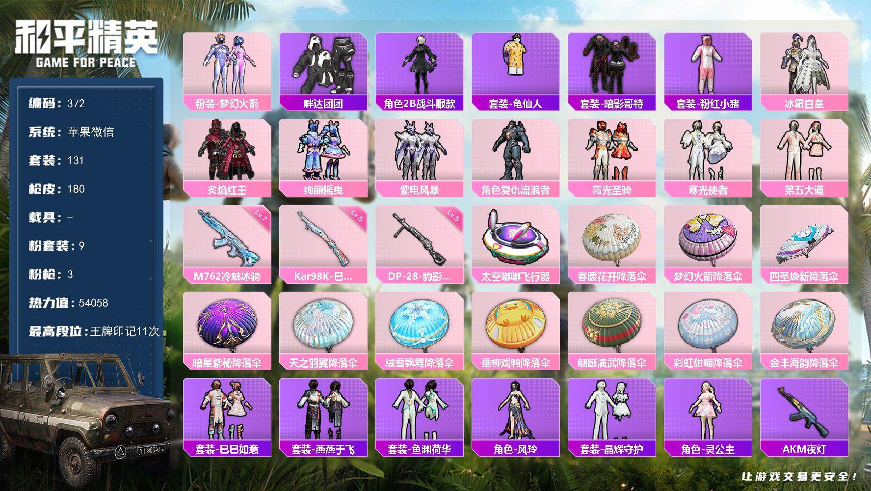 可二 游戏47级 2载具4粉5特效枪 66套装105枪皮 6印