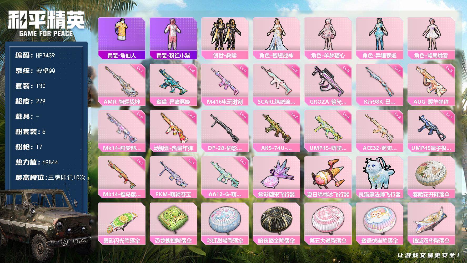 10粉装-10特效枪-0载具-3粉色飞行器-86962热力值-13王牌印记-189套装-270枪皮