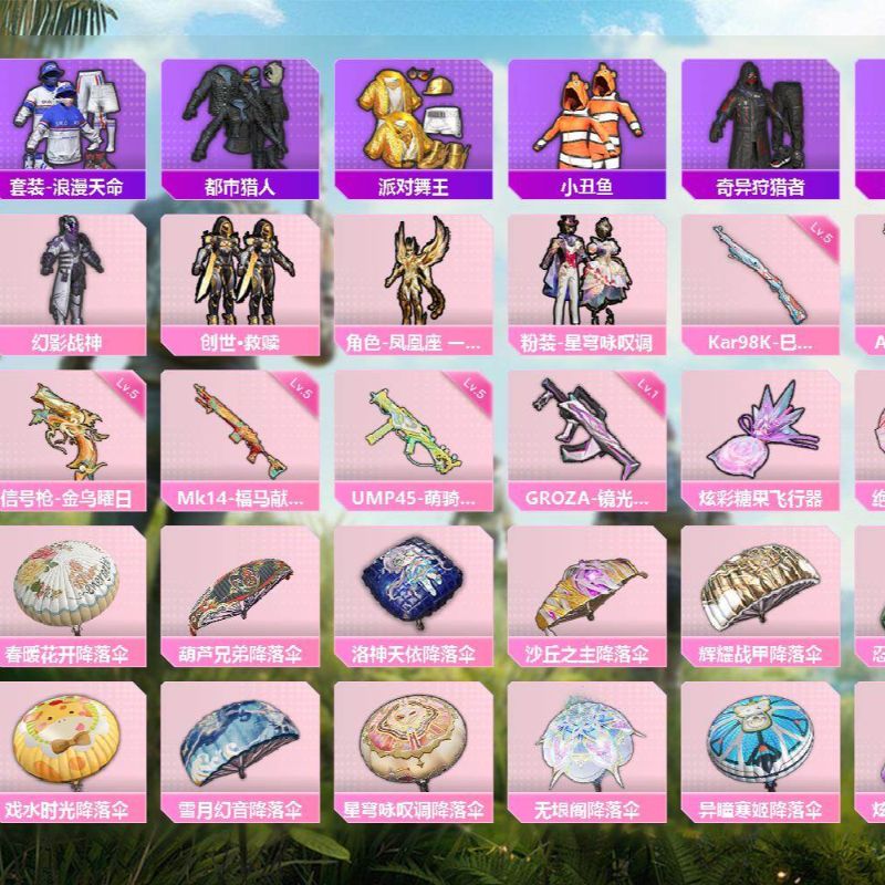 4粉装-6特效枪-2载具-2粉色飞行器-30298热力值-1王牌印记-72套装-105枪皮