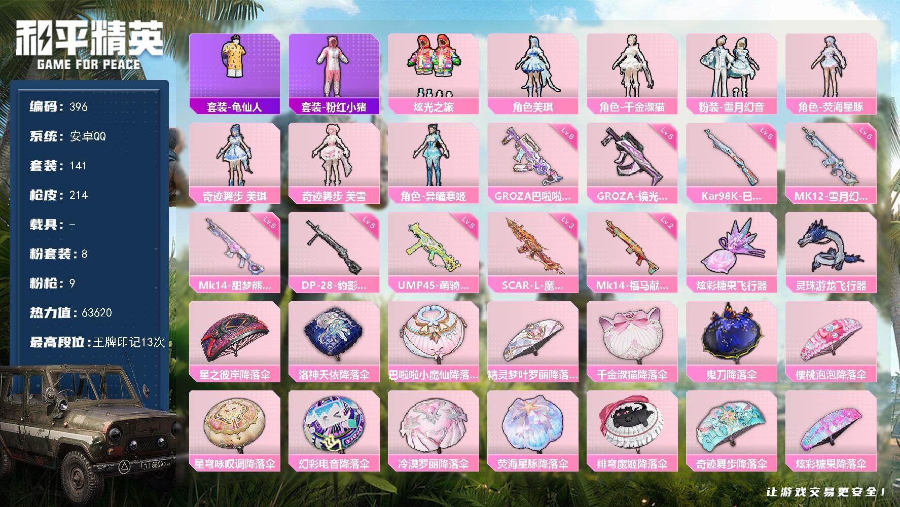 安卓 手Q-10粉装-9特效枪-0载具-4粉色飞行器-87551热力值-9王牌