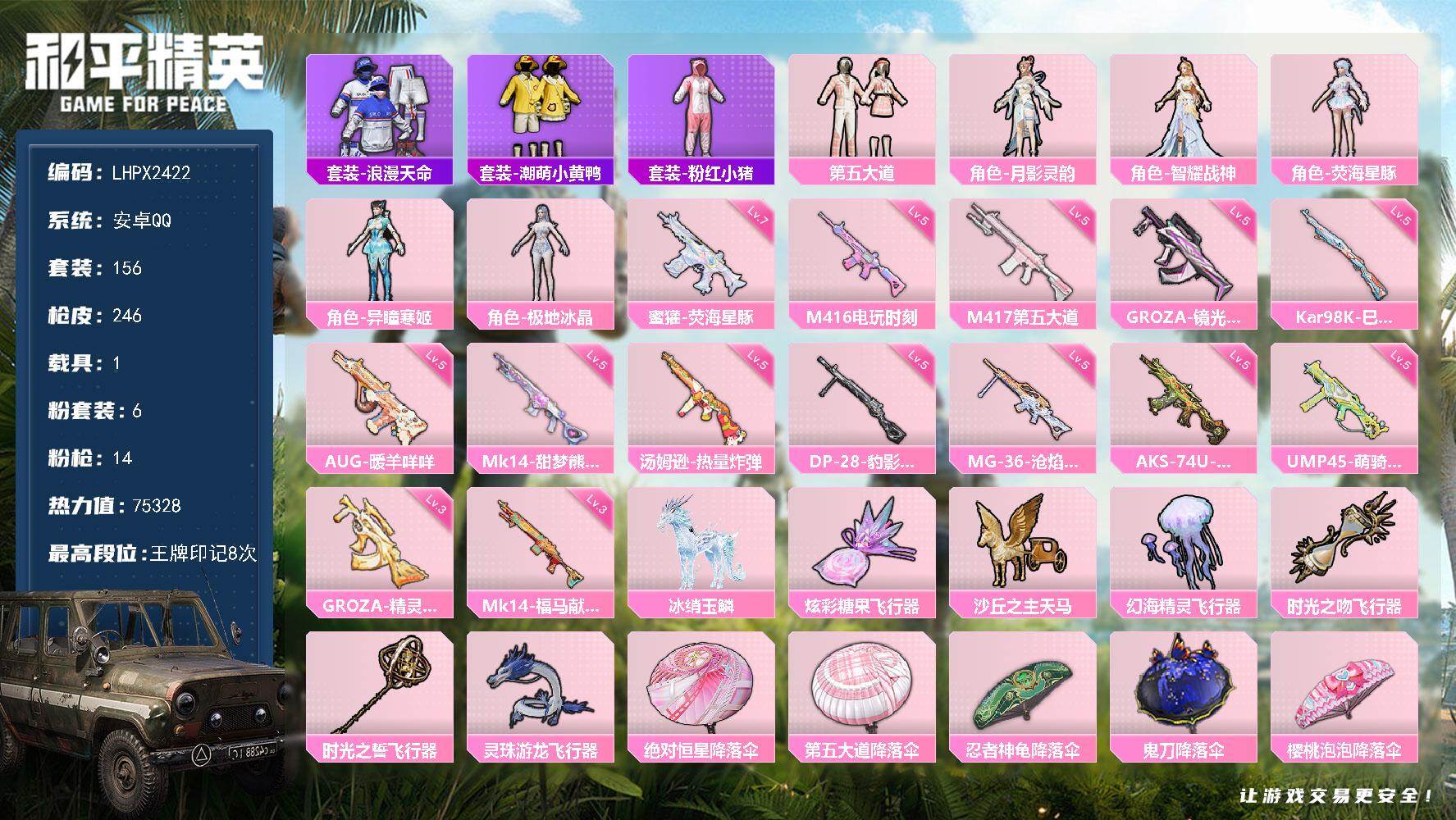 安卓 手Q-7粉装-3特效枪-1载具-1粉色飞行器-43790热力值-3王牌印
