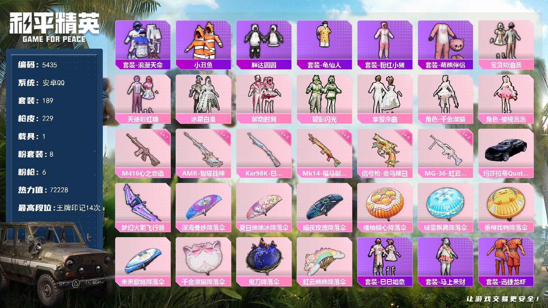 安卓 手Q-5粉装-10特效枪-0载具-1粉色飞行器-76224热力值-9王牌